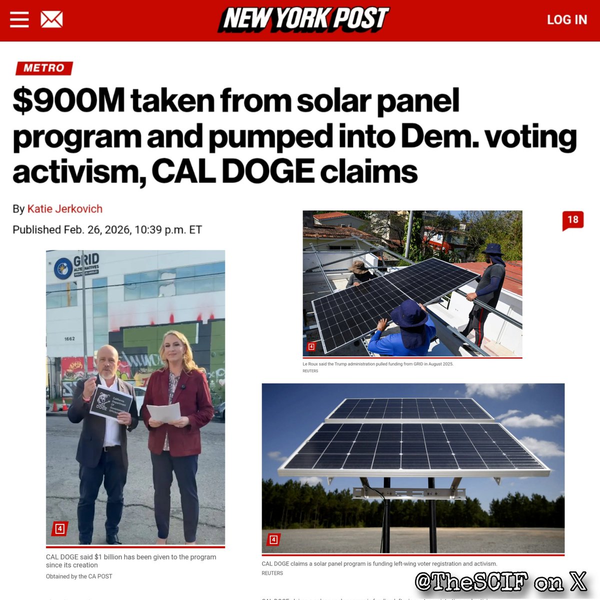 HUGE: $928 MILLION Stolen from California Solar Program and diverted to Democratic Voter Registration & Activism Efforts A new report from CAL DOGE alleges that $928 million from California's Solar on Multifamily Affordable Housing (SOMAH) program, intended to fund solar installations on affordable housing, has been diverted to Democratic voter registration and activism efforts. Funded by gas taxes and utility bills, the program has completed only 269 projects worth $72 million since 2015, raising questions about the missing funds.Organizations like GRID Alternatives and the California Environmental Justice Alliance (CEJA) are implicated, with CEJA's affiliated entity reportedly using public dollars for partisan activities, including voter mobilization and candidate endorsements. CAL DOGE calls for a full audit to ensure accountability.This highlights ongoing concerns about transparency in green energy initiatives. Source: NY Post