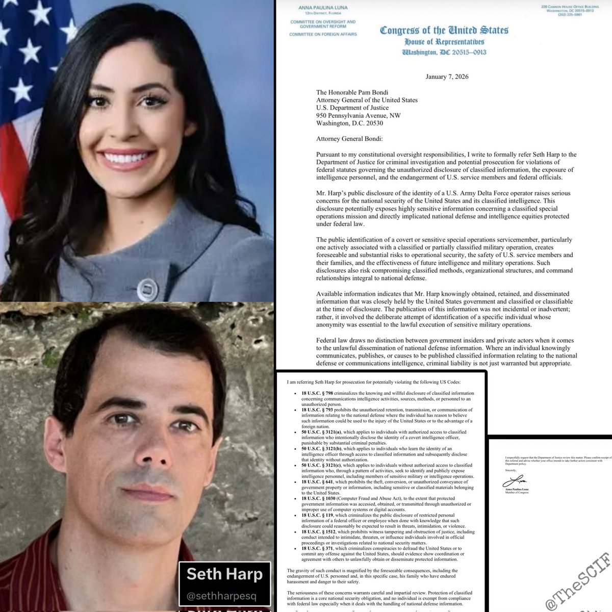 Rep. Anna Paulina Luna refers Seth Harp to the DOJ for investigation and pursues criminal charges regarding the intentional publication of information related to Operation Absolute Resolve, including the doxxing of a U.S. Delta Force operator. "That conduct is not protected journalism. It was reckless, dangerous, and put American lives at risk. The First Amendment does not give anyone a license to expose elite military personnel, compromise operations, or assist our adversaries under the guise of reporting."