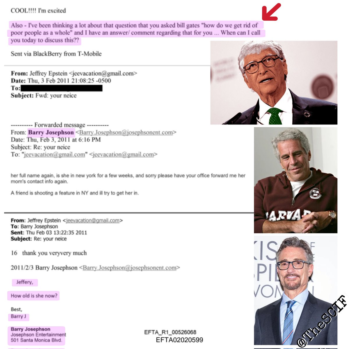 Epstein documents expose a 2011 email from Hollywood producer Barry Josephson to Jeffrey Epstein. In it, Josephson writes: "I've been thinking a lot about that question that you asked Bill Gates, 'how do we get rid of poor people as a whole' and I have an answer/comment regarding that for you…" It is Josephson referencing a supposed earlier conversation between Epstein and Gates discussing how to get rid of the "poor" population. And you wonder why Bill Gates was pushing the Covid vaccination so hard... They want to lower the population. You should clearly understand this by now, especially after experiencing what happened during Covid and what we know now.