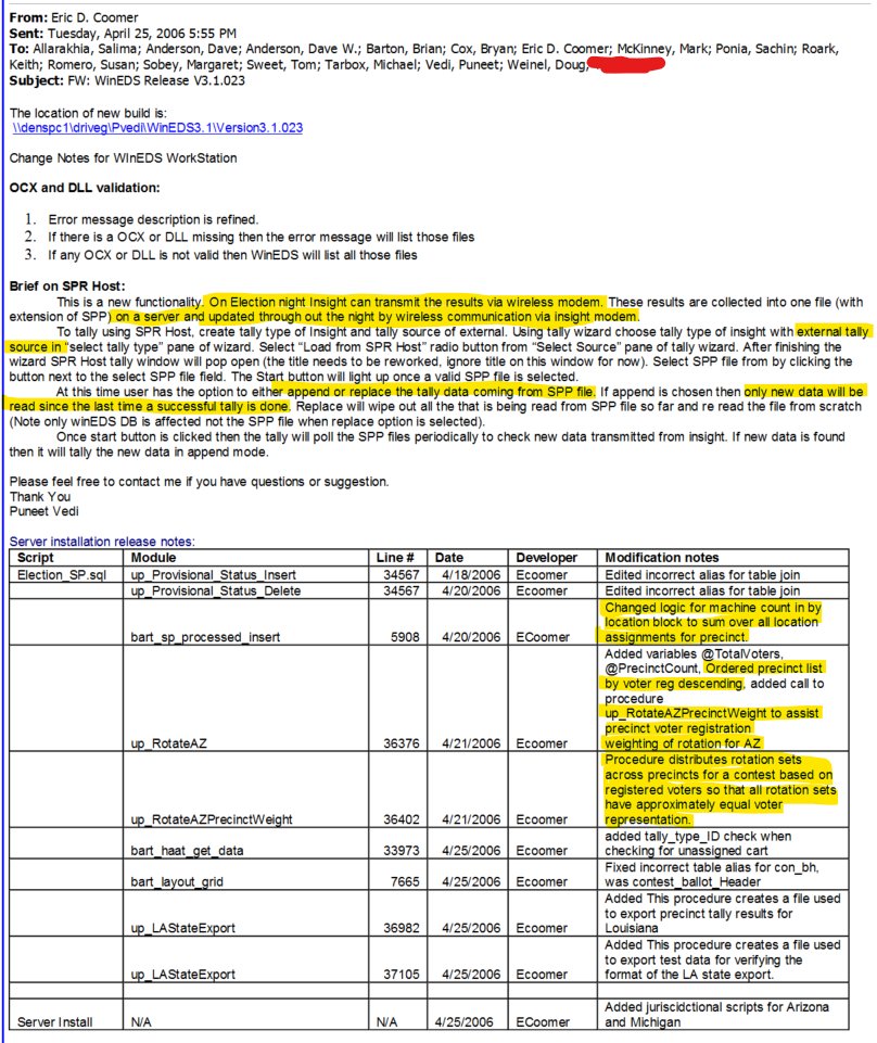 For anyone who hasn't seen this old document from Eric Coomer from Dominion when he used to be with Sequoia, he blantly talks about transmitting data from their machines through a wireless modem, including vote tallies, updates, changing voter rotation representation. These machines were specifically designed for fraud. How much more proof do you want?