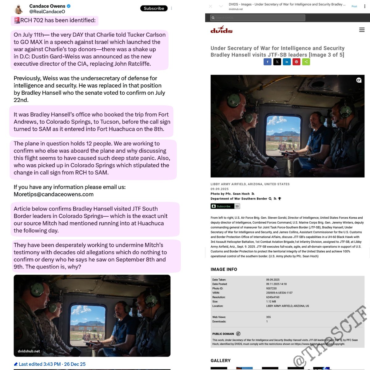 Candace Owens just dropped a bombshell, exposing potential deep state maneuvers tied to a mysterious flight, RCH 702, the flight she has just confirmed. On July 11th—the same day Charlie Kirk was urged to ramp up anti-Israel rhetoric, sparking donor backlash—a major CIA shakeup occurred. Dustin Gard-Weiss replaced John Ratcliffe as executive director. Gard-Weiss vacated his prior role as undersecretary of defense for intelligence, filled by Bradley Hansell on July 22nd. Hansell's office booked the RCH 702 flight from Fort Andrews to Colorado Springs to Tucson, switching to SAM callsign upon entering Fort Huachuca on September 8th. The plane seats 12; Owens' team is probing passengers and why Colorado Springs prompted the change—possibly a pickup. A linked article confirms Hansell visited JTF South Border leaders in Colorado Springs, aligning with source "Mitch's" sighting of the unit at Huachuca the next day. Owens questions the smear campaign against Mitch with old allegations, dodging his September 8-9th claims. "Why the panic?" she asks, inviting tips to moretips@candaceowens.com. This ties into broader suspicions around Charlie's "war" with donors and shadowy ops. Wild connections, but they seem to check out, and they wouldn't attack her if she wasn't over the target. Pay attention, but be cautious of injected disinformation and operators. @RealCandaceO Link: https://www.dvidshub.net/image/9307230/under-secretary-war-intelligence-and-security-bradley-hansell-visits-jtf-sb-leaders