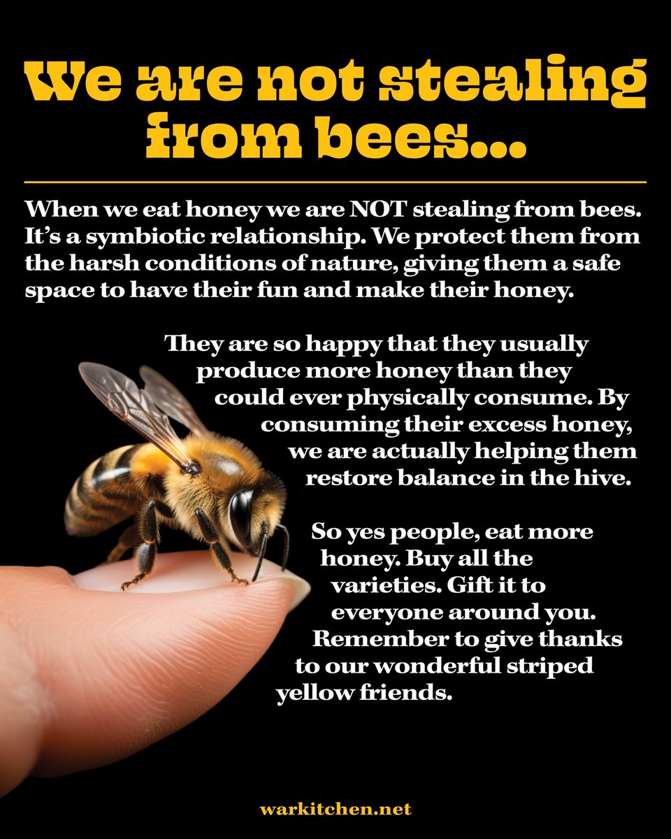 They Don't Teach You This About Honey Bees in Schools π: 1. Honey is the only food that has every single substance to sustain life. 2. Honey doesn't ever turn bad. You can actually eat honey that was found in Egyptian tombs thousands of years ago. (if you dare) βΌοΈ 3. A single bee produces just HALF a teaspoon of honey in its lifetime. Hard work. 4. The darker the honey, the more powerful its medicinal properties and the less sweet it is. The inverse also holds true. 5. Honey is the original antibiotic. It's been used as an antibacterial and antifungal for generations. 6. Honey is a natural sleeping pill. Consuming honey aids with the production of melatonin. Drink a warm cup of chamomile and take a shot of honey to the dome. Game changer. 7. You don't need to wash your honey dipper if you leave it in the jar of honey itself. Honey is a natural preservative, so bacteria will not grow. 8. To make one pound of honey, bees need to visit 2 million flowers. 2 MILLION. 9. Honey is the only food made by an insect that's actually eaten by BOTH the insect and us. We're literally best friends. 10. Honey is one of the original remedies for an everyday cough & allergies. Local honey is said to be useful in curing seasonal allergies. 11. Bees don't sleep. Work hard. Play hard. 12. Honey is excellent on burns. Cool the burn in running water. Pat it dry. Apply raw, organic honey. It will speed up healing and even reduce any eventual scarring. 13. Babies under 12 months of age shouldn't ingest honey (their immune system isn't yet strong enough to handle a certain strain of bacteria that's quite prevalent in honey) 14. Honey, like a lot of "animal-based" products have a myriad of topical and oral applications that make it incredibly versatile. Nature's all purpose drug. 15. The only honey that exists in my world is raw, organic unfiltered honey. To pasteurize honey is to ruin the work of thousands of bees. You are literally a war criminal. 16. Everyone raves about Manuka honey, but the real ones have tried Jarrah. If you know, you know. 17. Honey is one of the best hydration sources in the world. Honey > Pre Workout. 18. Honey is nature's moisturizer. 19. Royal jelly is a special compound that worker bees secret; so potent it can transform an ordinary bee into a queen bee. It's like a concentrated, supercharged version of honey. 20. The honey bee is a crucial part of our ecosystem. Without their help, over a third of all food eaten in America wouldn't exist. 21. Honey should be a key ingredient in shampoos. Cleopatra did it. Why shouldn't we? 22. Bees communicate with other bees by dancing. That's how they signal where the best flowers are. Seems familiar... 23. Honey is a source of flavanoids and phenolic acids βΒ antioxidants which have been studied to have incredible anti-inflammatory and even anti-cancer properties. 24. The hexagonal shape of honeycomb cells is a MARVEL. How did they know to use hexagons? Hexagons are the most efficient shape to store the maximum amount of honey with the least amount of wax needed to build. Geniuses. To the anti-honey community: When we eat honey we are NOT stealing from bees. It's a symbiotic relationship. We protect them from the harsh conditions of nature, giving them a safe space to have their fun and make their vomit. They are so happy that they usually produce more honey than they could ever physically consume. By consuming their excess honey, we are actually helping them restore balance in the hive. So yes people, eat more honey. Buy all the varieties. Gift it to everyone around you. And always remember to give thanks to our wonderful striped yellow friends ππ₯