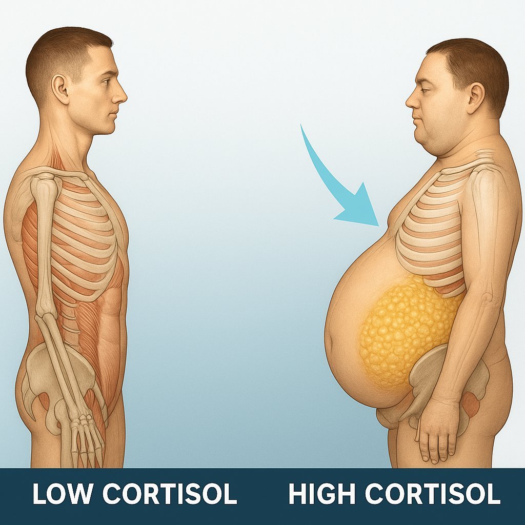 What High Cortisol Does Chronic stress → high cortisol → chaos: • Blood sugar spikes • Insulin resistance • Central fat gain (belly/face/chest) • Cushing’s syndrome risk Stress ages you from the inside.