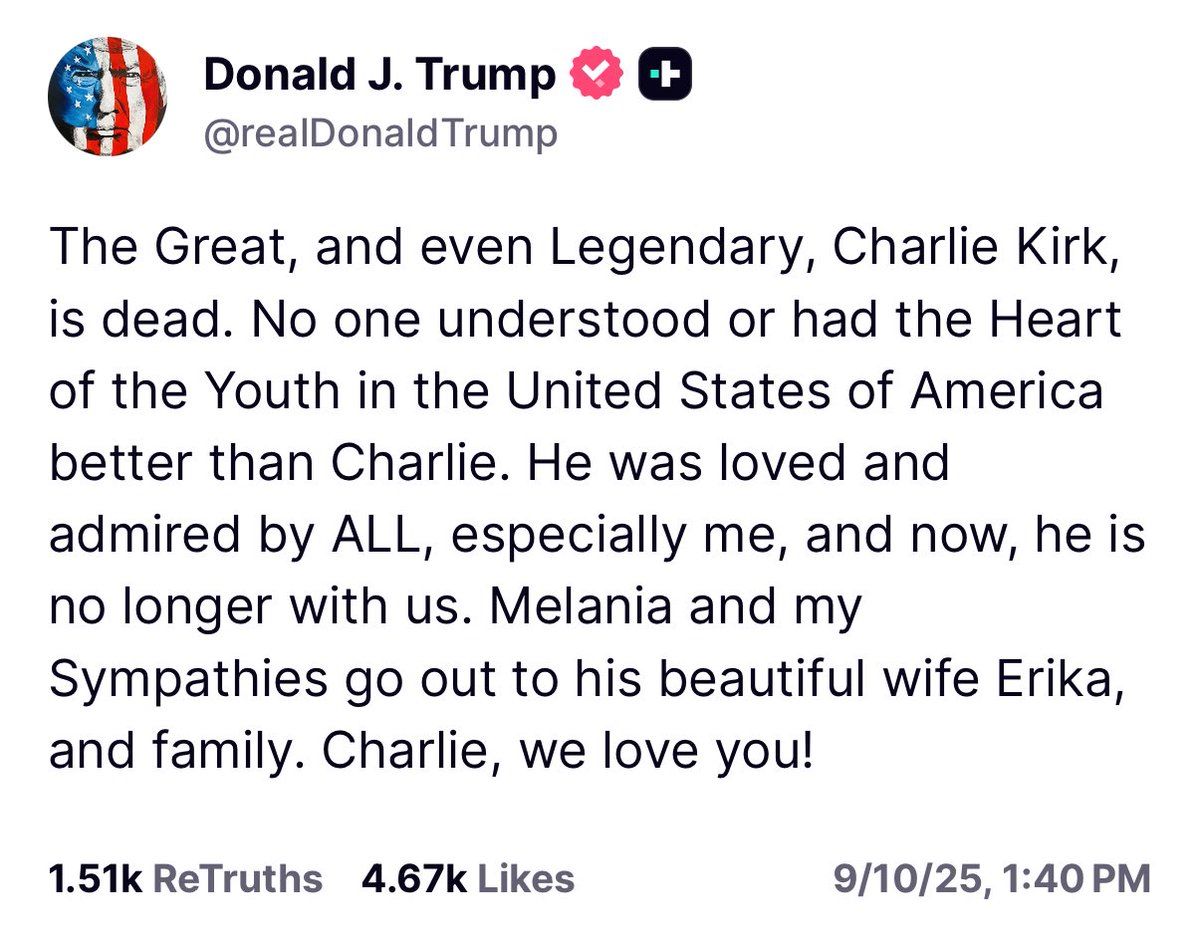 President Trump confirms Charlie Kirk has been pronounced dead at age 31. Beyond heartbreaking. π https://t.co/7lEywlv78D