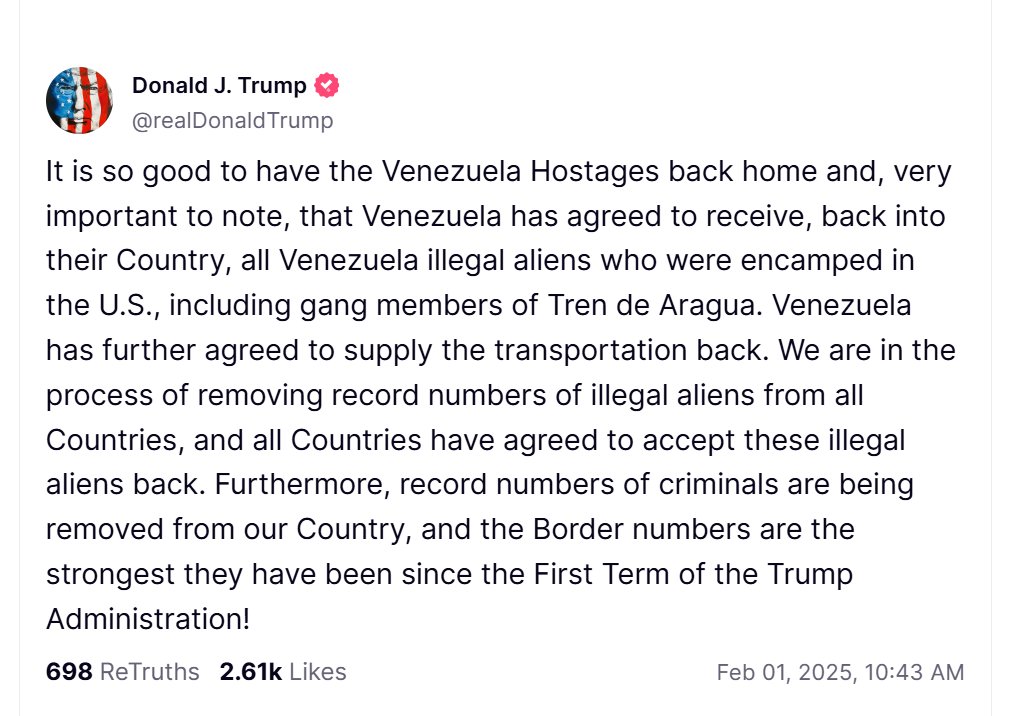 BREAKING HUGE: @RealDonaldTrump announces "that Venezuela has agreed to receive, back into their Country, all Venezuela illegal aliens who were encamped in the U.S., including gang members of Tren de Aragua. Venezuela has further agreed to supply the transportation back." https://t.co/z7CzH0eIgp