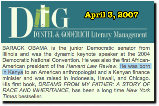 From 1991 until April 2007, Obama's literary agents promoted him as "born in Kenya." But after he announced his candidacy for president, they changed it to "born in Hawaii." web.archive.org/web/2007042111… web.archive.org/web/2007040319… https://t.co/EWufpRUMG2