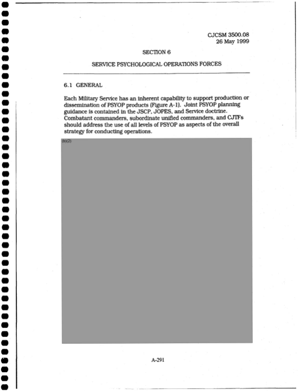 The Black Vault has successfully obtained a new release of a previously heavily redacted document, which sheds new light on a military manual concerning Joint Psychological Operations Task Force (JPOTF) headquarters training. The document, originally requested under the Freedom of Information Act (FOIA) case 09-F-1583 in 2009, and partially released in 2014, contained multiple redactions under FOIA exemption (b)(2), primarily concerning internal personnel rules and practices of an agency. However, following a 2016 case filed by The Black Vault to request a re-review under 16-F-1727, the document has now been released in full, with no redactions. Exemption (b)(2) is often cited to protect sensitive information related to internal rules, processes, and management of an agency, particularly when disclosure would risk circumvention of those rules. In the original release of the document, these redactions appeared throughout, obscuring details of how JPOTF headquarters operate during psychological operations (PSYOP), including its organizational structure, training methodology, and mission-related tasks. The 2016 re-review of the document resulted in a full release with no redactions. This version, now available for download below, includes significant information previously withheld. The document, titled “Joint Psychological Operations Task Force Headquarters Master Training Guide,” provides comprehensive guidance for military leaders on training and organizing PSYOP units. https://www.theblackvault.com/documentarchive/foia-victory-full-disclosure-of-military-psychological-operations-training-document/ The second and third images below: 2014 Release on the left, while the 2024 Release is on the right. FOIA Victory: Full Disclosure of Military Psychological Operations Training Document [331 Pages, 67MB] https://documents2.theblackvault.com/documents/osd/16-f-1727.pdf