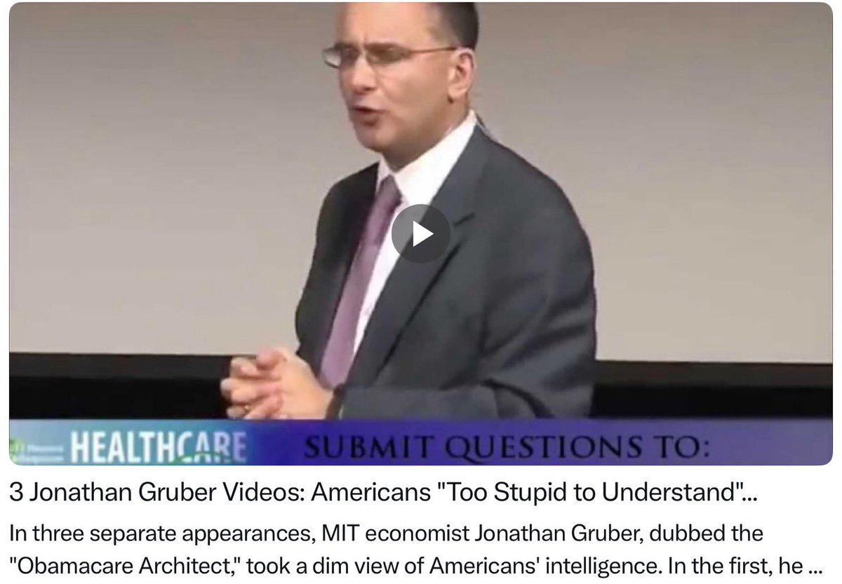 Remember this 🤡? Jonathan Gruber the architect of Obamacare and the ACA calling Americans ‘too stupid to understand’ Obamacare. These people REALLY hate Americans and believe they are better than everyone else. Democrats need to just admit it, they were duped. Watch it here: youtu.be/Adrdmmh7bMo