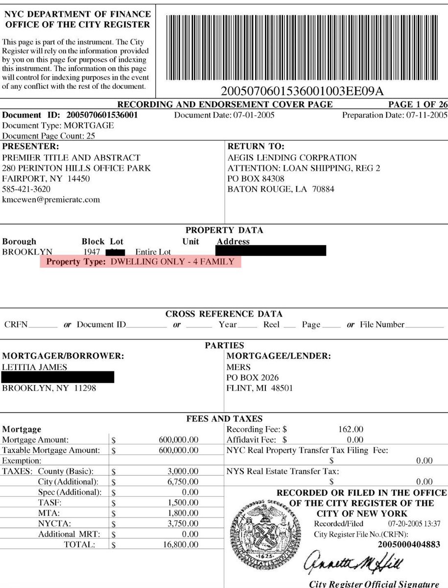 Additionally, Letitia James is about to be charged with mortgage fraud, a federal crime because it is a federal government HAMP loan. For over two decades, Letitia James repeatedly claimed her Brooklyn apartment building was a four-unit property on mortgage applications—despite official records proving it had five. This may seem a minor discrepancy, but misrepresenting the unit count enabled her to secure more favorable loans, including a 2011 Home Affordable Modification Program (HAMP) loan that saved her tens of thousands of dollars annually. Now, the same legal principles she used to prosecute others may be her downfall. But there’s more. According to New York City Department of Finance records, on May 20, 1983, Letitia James and her father, Robert James, took out a real estate loan from Kadilac Funding Ltd. for $30,300 as “husband and wife." For the record, Letitia James' mother is Nellie James.