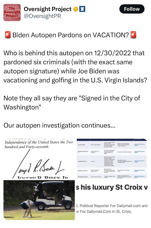 Who is Behind This Autopen? Six Criminals Were Pardoned with Biden Autopen – *Signed in the City of Washington* – On Same Day Joe Biden Vacationed and Golfed in St. Croix. https://t.co/Atah7bsTNi