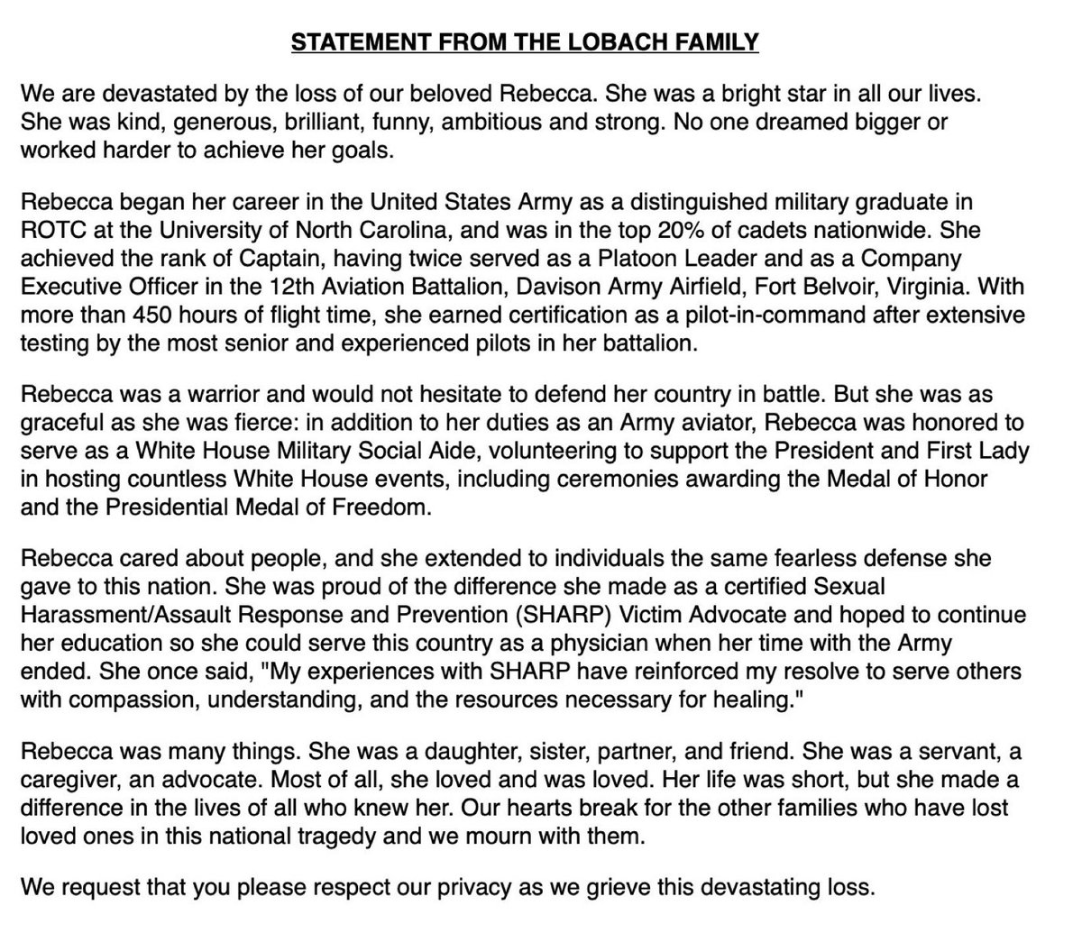 The Army also released the following about CPT. Lobach, including a statement from the family. Cpt. Rebecca M. Lobach, of Durham, North Carolina, served as an aviation officer (15A) in the regular Army from July 2019 to January 2025. She has no deployments. She was assigned to the 12th Aviation Battalion, Ft Belvoir, Va. Her awards include the Army Commendation Medal, Army Achievement Medal, National Defense Service Medal and Army Service Ribbon.