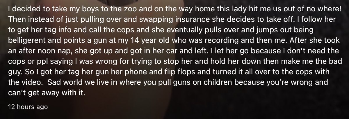 A hit-and-run incident escalated in when a black woman struck a family's vehicle and fled. The father followed to obtain her license plate, but she stopped, exited her car, and pointed a gun at his 14-year-old son, who was recording, and himself. The father was able to disarm her https://t.co/FONe230QN4