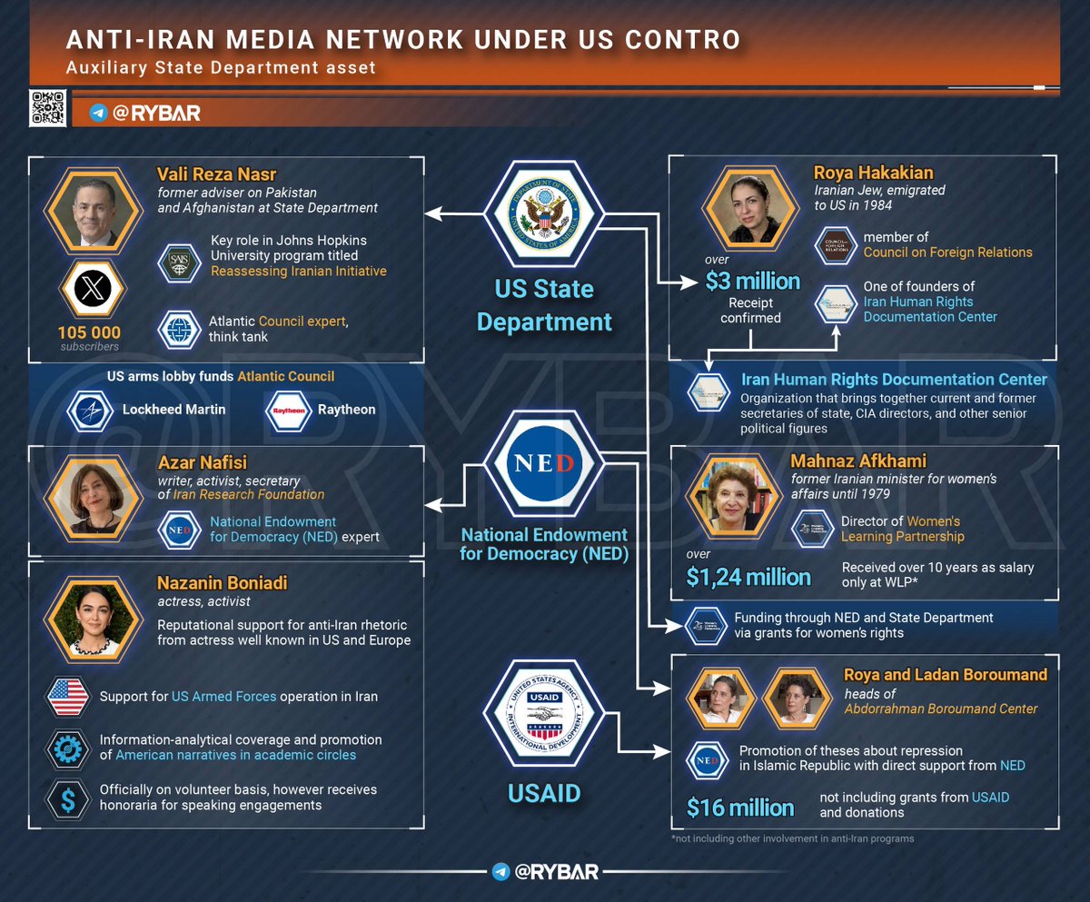 Here is more on the CIA's network of Iranian assets. Funded by the U.S. State Department – Part 2 The media network operating in the U.S. on Iran is one of the largest in the American segment. It mainly consists of small-scale journalists, experts, and analysts working in various journalistic outlets or think tanks supported by the State Department. However, there are other more significant “assets” known in narrower circles, who possess authority and the needed background as "fighters against tyranny in Iran." Masih Alinejad serves as the hub where these people converge, but each of them plays their own role. 🔻Who’s who in the media network? ▪️The second most important figure after Alinejad is actress of Iranian descent Nazanin Boniadi. She is known for the TV shows “How I Met Your Mother” and “Homeland.” While her acting career might not be called highly successful, she found another path. She has been an activist for women's rights practically her entire life. She is invited to various forums, officially on a volunteer (unpaid) basis. However, where she operates, there is information about payments, though the amounts remain unknown. ▪️Two other significant assets with strong media presence are writer Azar Nafisi, who is officially an expert at the National Endowment for Democracy (NED), and Mahnaz Afkhami – former Minister for Women's Affairs in Iran before the 1979 Islamic Revolution. The first wrote the provocative book "Reading Lolita in Tehran," which quickly gained popularity in the West because it described the hardships women faced under the "oppression" of Iran. The latter, after emigrating, quickly adapted in the U.S. Under her, several anti-Iranian organizations were established, the latest being the Women’s Learning Partnership under the oversight of NED. She serves as director there, and over ten years has received about $1.24 million in official income. ▪️In academic circles, the promotion of anti-Iranian rhetoric is handled by the Abdorrahman Boroumand Center, which researches repression in Iran since the Islamic Revolution. It has received over $16 million over the years. Currently, the center is headed by two sisters – Roya and Ladan Boroumand – who actively cooperate with Masih Alinejad. A cross-check of their activities shows how they support each other. ▪️Among their colleagues is even an Iranian Jew – a perfect match for the current situation. This is Roya Hakakian, who fled Iran in 1984 and has been active in political work since the 1990s-2000s. She is one of the founders of the well-known Iran Human Rights Documentation Center, which directly received $3 million from the State Department at its inception. For her services to the U.S., Hakakian became a member of the Council on Foreign Relations—a prestigious organization including current and former American officials and intelligence officers. ▪️Finally, it’s important to mention Reza Vali Nasr. He once served as an advisor on Pakistan and Afghanistan affairs at the State Department. Later, he became an expert at the think tank Atlantic Council—an analytical organization promoting the interests of the arms lobby. Among the Atlantic Council’s corporate sponsors are Lockheed Martin and Raytheon—key beneficiaries of the new war. With the start of the operation, he has been actively running social media, not in an overtly propagandistic manner but relatively balanced, which distinguishes him from others. He is now one of the key figures in Johns Hopkins University’s new program: “Revisiting the Iran Initiative.” Therefore, the media component of the U.S. campaign against Iran plays as crucial a role as the military one. Washington actively promotes the narrative of its right to this operation, implanting necessary ideas in the minds of Western laypeople. To do this, it uses Americans of Iranian descent who supposedly care for their historical homeland.