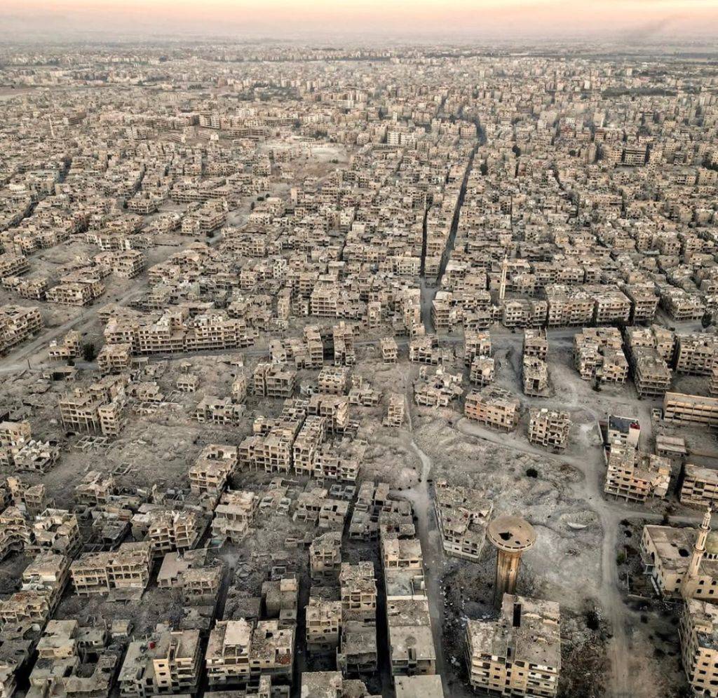 The 'new Syria': no borders, no territory, no water, no crude oil, no army, no air defence and no weapons (except for those held by murderous al-Qa'ida gangs and foreign proxies). Just ISIS-in-suits, lots of Mossad, thousands of American troops, French Special Forces, German spies, Turkish asset-strippers, British 'diplomats', Zionist troops and constant Zionist airstrikes. The 'Blessed Revolution', which took one of the Arab world's most economically productive, stable and culturally sophisticated states and turned millions into refugees or vanished them into dust. First they told you it was for 'democracy'. Then they told you it was about removing a 'brutal tyrant' (unlike the very genteel Gulf rulers funding the regime change). Then they dared to tell you it was about 'Syrian agency', while all those telling you so were working for US intelligence front organisations. Now the ISIS-in-suits regime is in charge, they tell us it was about Iran and Hizballah all along. A sectarian war to smash Muslim unity; smash the Resistance; hand Syria over on a plate to the Zionists; and turn it into a playground for the financial interests of everyone who paid for the dirty war, all now jostling for their piece of the pie. And those who never understood — or lapped up the sectarian bloodlust — clap along like seals. Photo shows the suburbs of Damascus now.