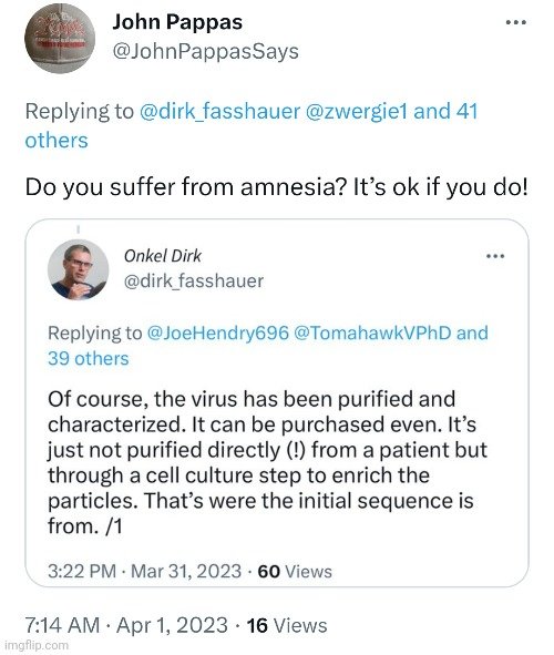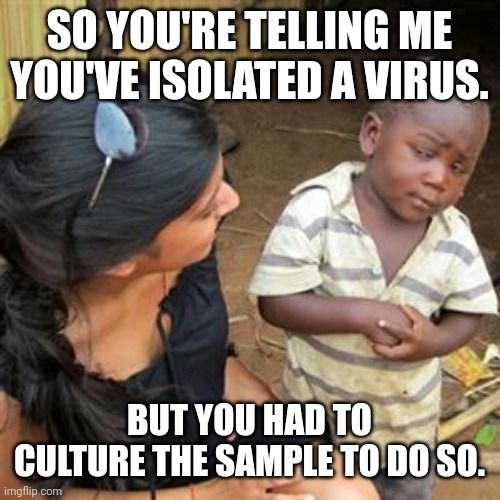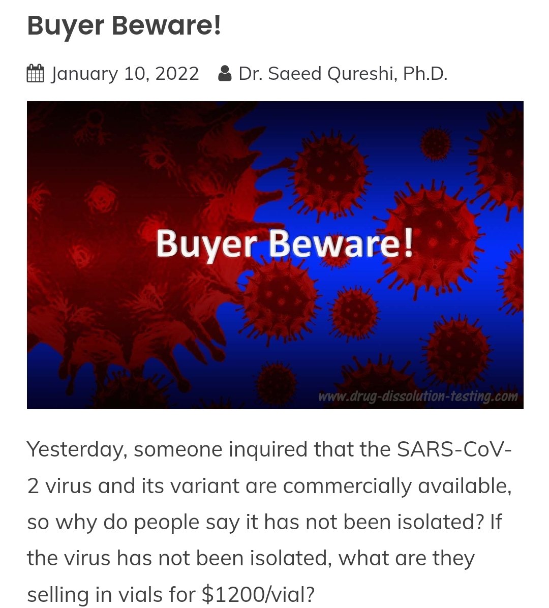 16. It is not the (isolated) virus but the lysate/isolate, i.e., soup from “culturing” the swab sample. The fact remains, no one has isolated, purified, and characterized the virus. Therefore, it is not available from anywhere. Sorry! https://bioanalyticx.com/buyer-beware/