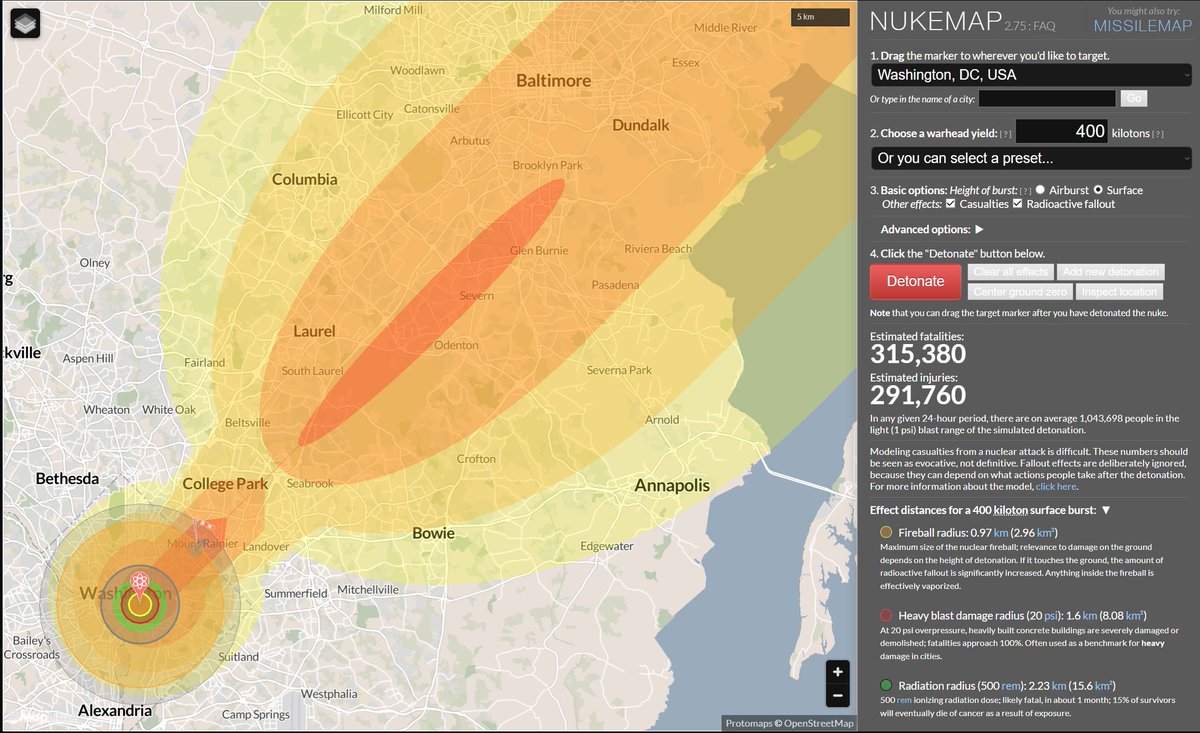 NukeMap - Detonation radius, injuries, fatalities by target city. https://t.co/Ay1TZ8DMU2