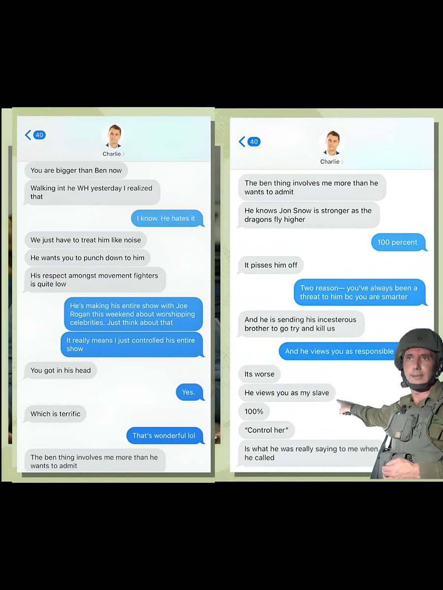 Candace produced more text messages between her and Charlie Kirk talking about Ben Shapiro. “We need to treat Ben like noise” “he’s sending his [incestuous] brother to go try and kill us” “he views you as my slave” -CK Ben may need 5150, Megyn Kelly rant backfired. https://t.co/kQaMHgugnq