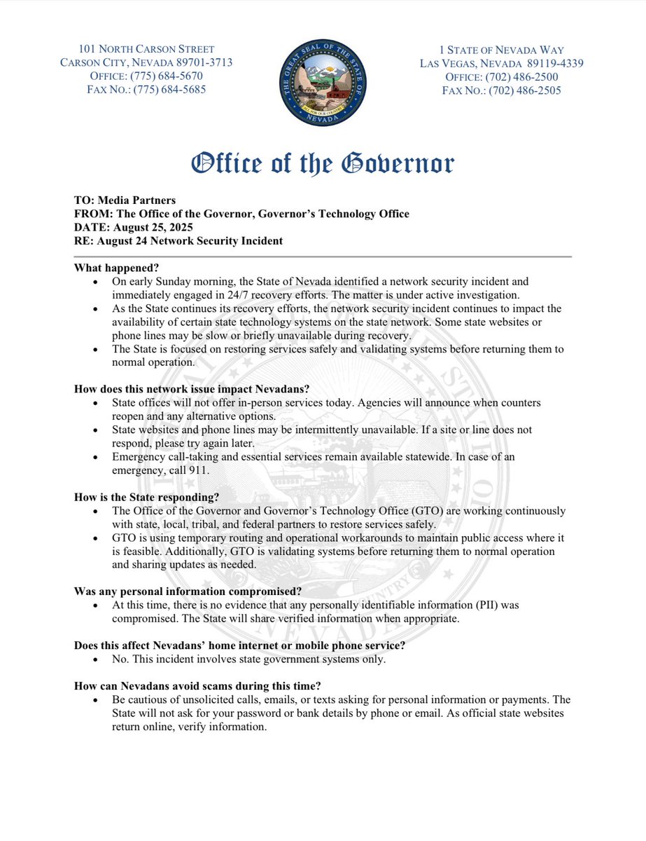 🔥Nothing to see here. The State of Nevada had a “security breach” so bad that it had to close State Offices tied to @CISAgov Let’s hope none of the court records tied to Alexandrovich and held by Switch data centers, which incidentally also holds all the data for SalesForce, Crowdstrike, and THE STATE OF NEVADA was impacted. Stay tuned…