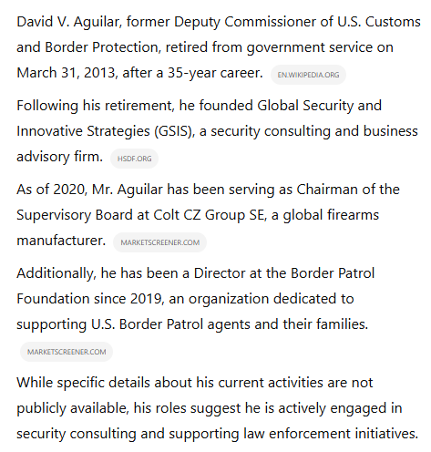 Where is David Aguilar now? As of 2020, Mr. Aguilar has been serving as Chairman of the Supervisory Board at Colt CZ Group SE = Weapons. And, Director of the Border Patrol Foundation = Laundering Money for GSIS, most likely.