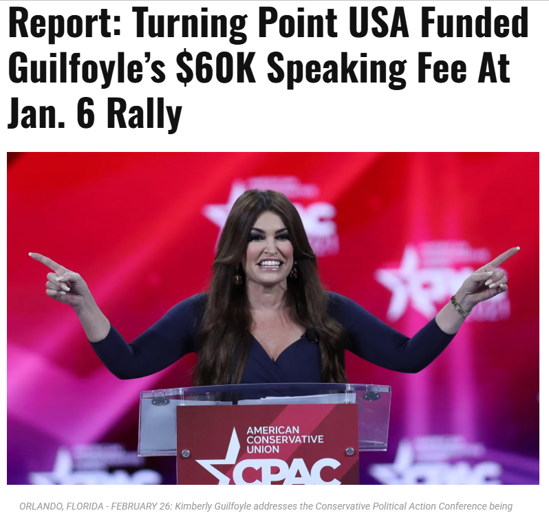 @DougDucey @YairNetanyahu @TPUSA @realannapaulina @TPointUK @tylerbowyer's Turning Point Action paid Kimberly Guilfoyle’s $60,000 fee to introduce her fiancé Donald Trump Jr. in a speech that lasted under three minutes at the “Stop the Steal” rally on Jan 6th. Huge. Money. Laundering. PsyOp. https://talkingpointsmemo.com/news/turning-point-usa-guilfoyle-january-6-stop-the-steal-rally