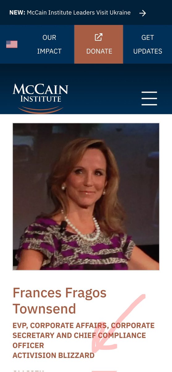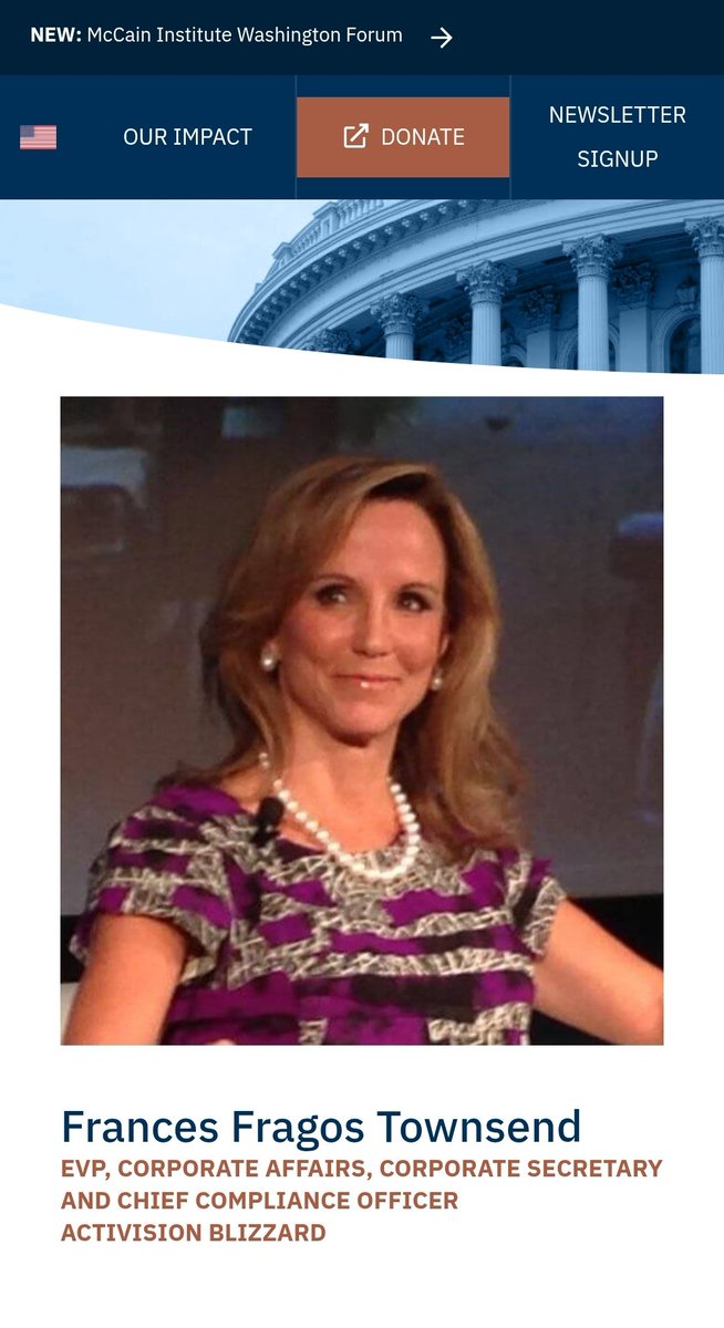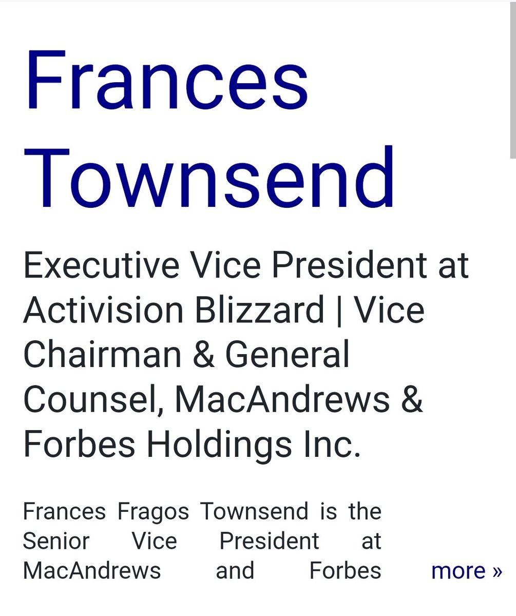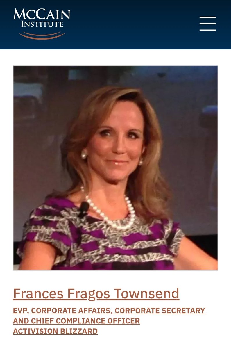 @AZKellyT @ATVI_AB Frances M. "Fran" Fragos Townsend (born December 28, 1961) is an American lawyer and business executive on the @McCainInstitute Board. https://en.wikipedia.org/wiki/Frances_Townsend