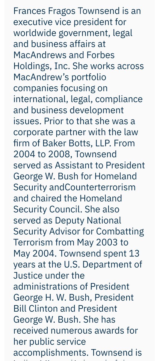 @AZKellyT @ATVI_AB @McCainInstitute @RudyGiuliani @AsaHutchinson @GovMikeHuckabee @SarahHuckabee @PaulRyan Francis "Fran" Townsend sits on the @McCainInstitute Board.