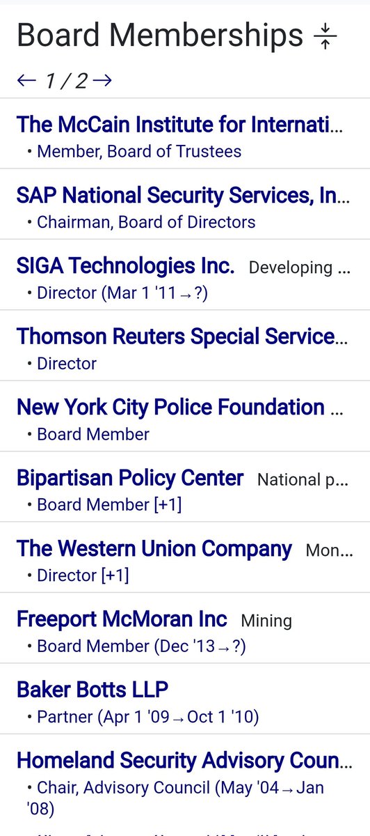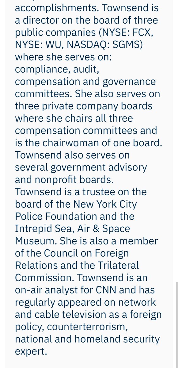 @AZKellyT @ATVI_AB @McCainInstitute @RudyGiuliani @AsaHutchinson @GovMikeHuckabee @SarahHuckabee @PaulRyan Townsend also currently serves on the boards of the Council on Foreign Relations with former Obama DHS Sec, and AZ Governor, Janet Napolitano; and The Carlyle Group's David M. Rubenstein. https://en.m.wikipedia.org/wiki/Council_on_Foreign_Relations
