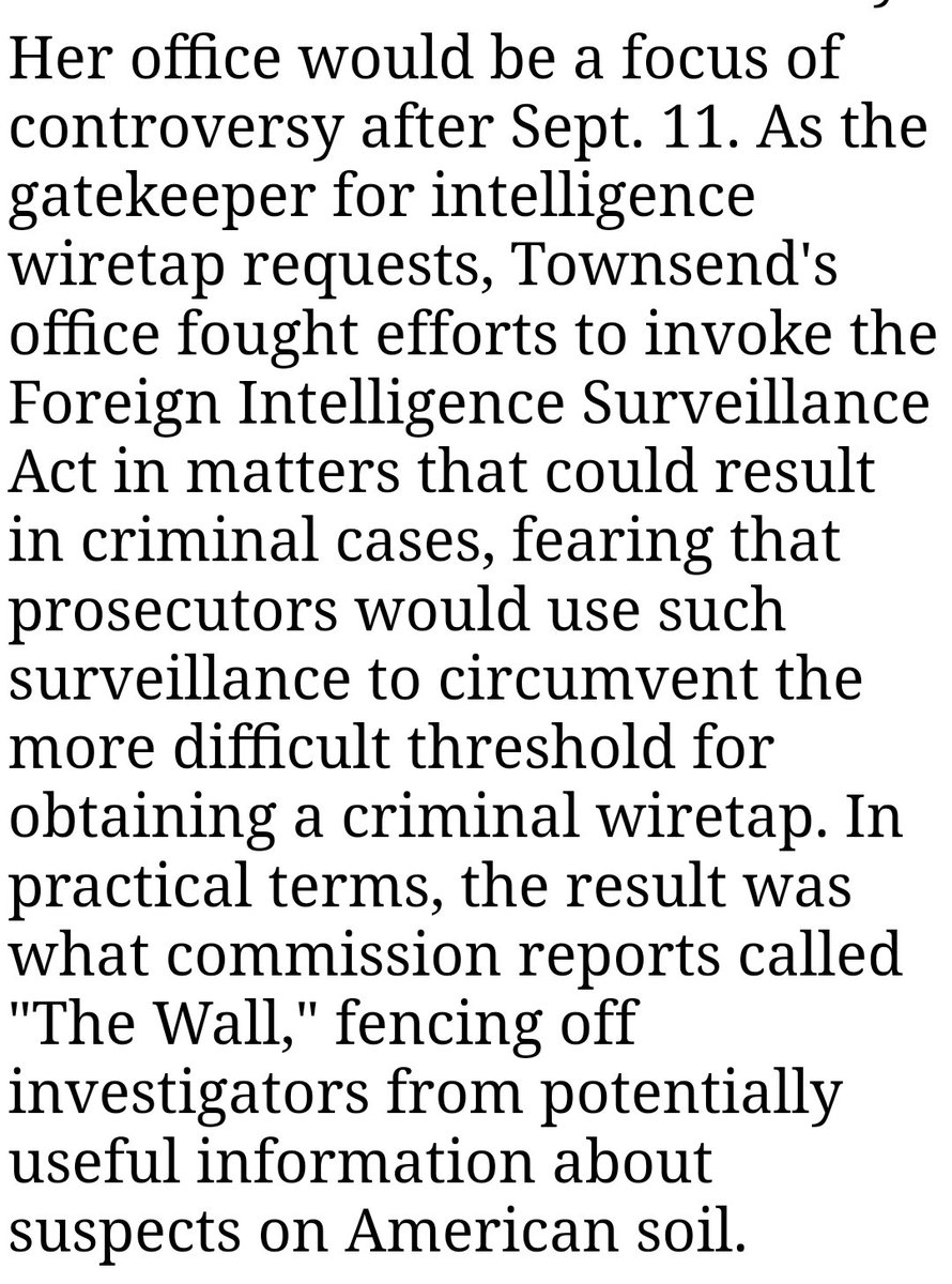 @AZKellyT @ATVI_AB @McCainInstitute @RudyGiuliani PROBLEM: Townsend's Intelligence office Gatekeeping FISA from bad actors blocked investigators from potentially useful information about suspects on American soil. REACTION: Bad actors use Sept 11th Fear Porn to push Safety over Privacy. SOLUTION: The Patriot Act ...