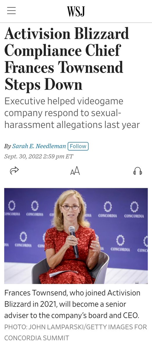 @AZKellyT @ATVI_AB @McCainInstitute @RudyGiuliani @AsaHutchinson @GovMikeHuckabee @SarahHuckabee @PaulRyan @BernardKerik @GenFlynn Francis Townsend was brought into Activision Blizzard to control the narrative following sexual-harassment allegations at the company... That's what she does.