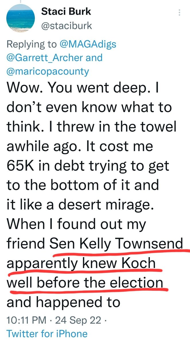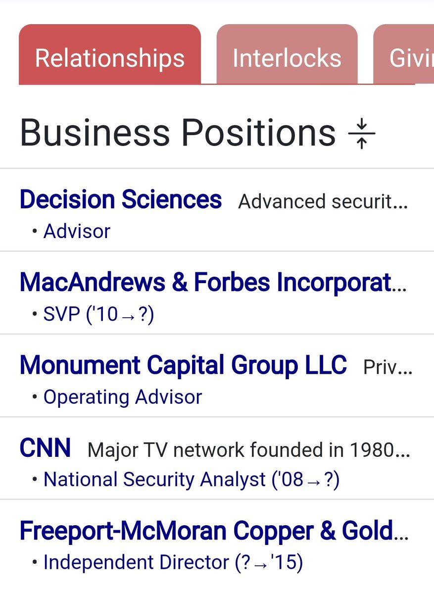 @AZKellyT @ATVI_AB @McCainInstitute @RudyGiuliani @AsaHutchinson @GovMikeHuckabee @SarahHuckabee @PaulRyan @BernardKerik @GenFlynn Francis "Fran" Townsend has the McCain connection. Kelly Townsend has the Koch connection. According to @staciburk.