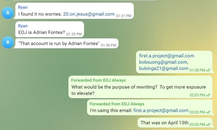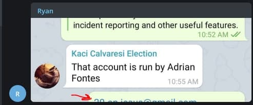 @Kacinpoint replying to #RyanHartwig re: #Fontes You can see the 20.on.jesus@gmail.com right below where Kaci Calvaresi says, "That account is run by Adrian Fontes". Both "sides" were running the audit psyop. The left in Twitter and the Right in Telegram. https://t.co/2j19BN24d3