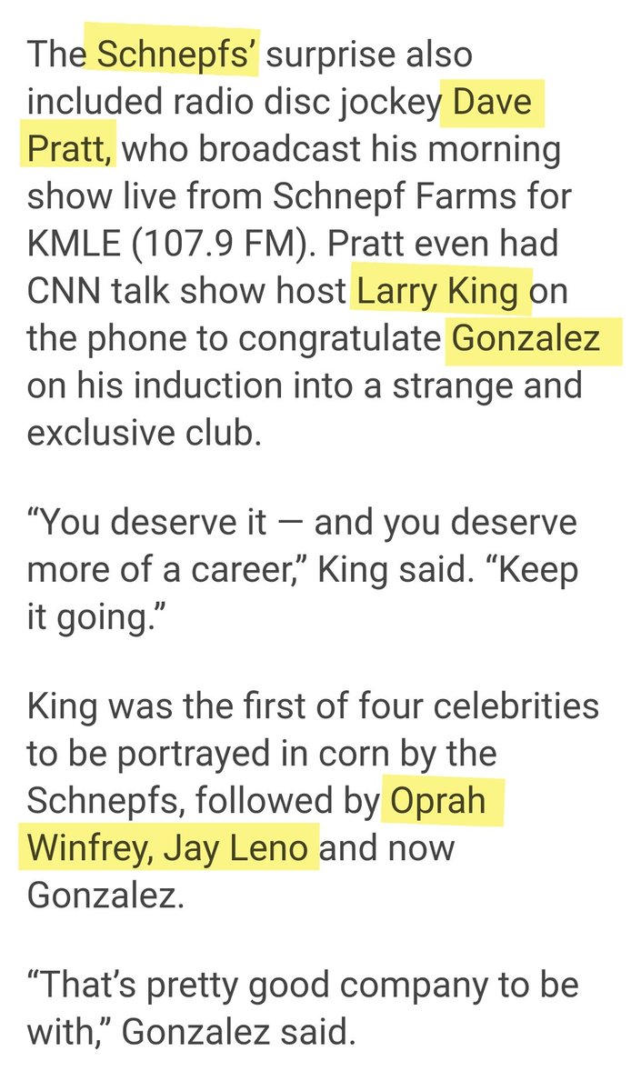 @drewsexton23 @laurenboebert @MittRomney @KariLake @Brookfield @RogerJStoneJr Larry King was the first of four celebrities to be portrayed in corn by the Schnepfs, followed by Oprah Winfrey, Jay Leno and now Luise "Gonzo" Gonzalez. No, @LuisGonzo. Not good company to keep. https://www.eastvalleytribune.com/news/schnepf-farms-goes-gonzo/article_8af071b8-624e-51a7-8e1d-6949e7aacf62.html