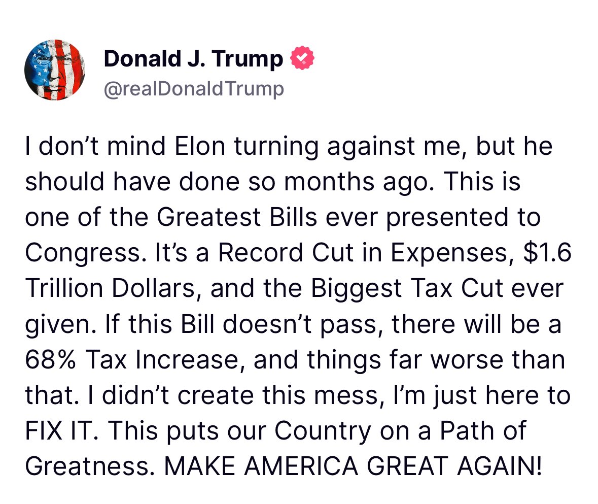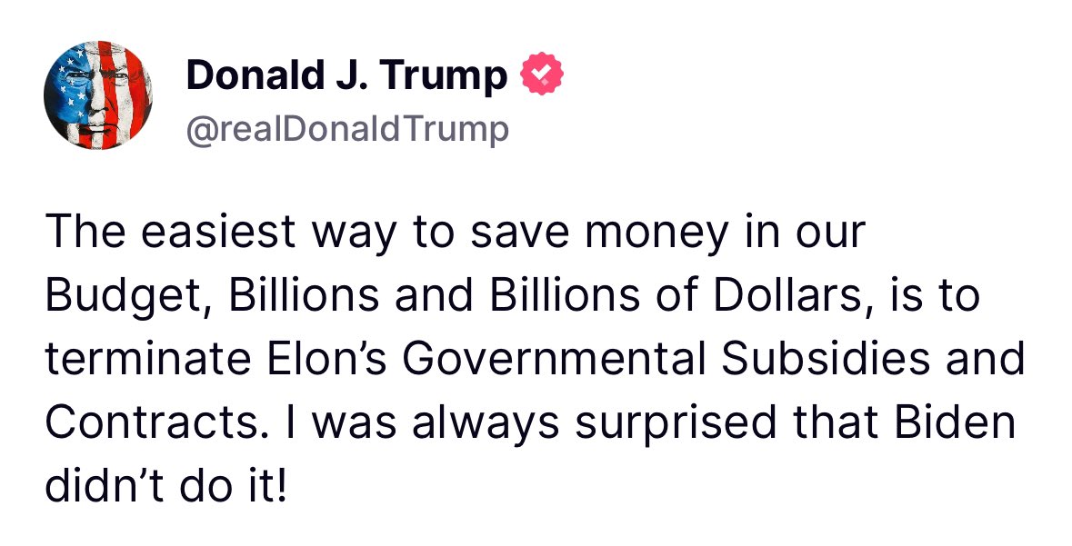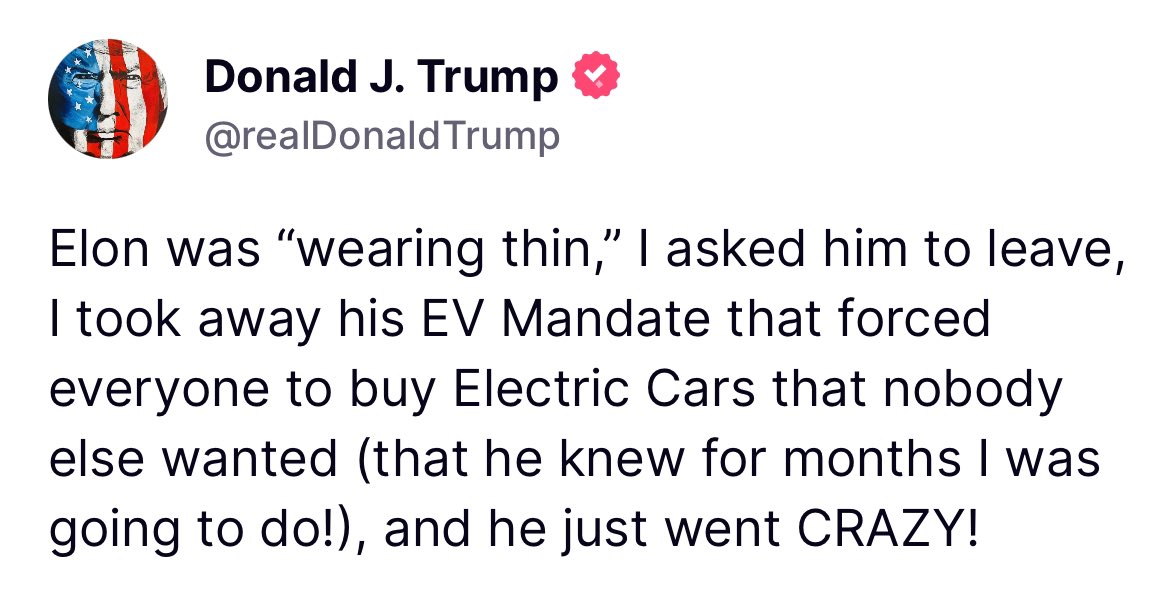 President Trump on @elonmusk: "Elon has never asked me for a thing. I mean, I got rid of the EV mandate ... but he's never asked me for a thing. I think that's an amazing attribute ... Elon is a patriot, we want to thank you very much for the job you're doing." https://t.co/Z4fHG3Bxtl