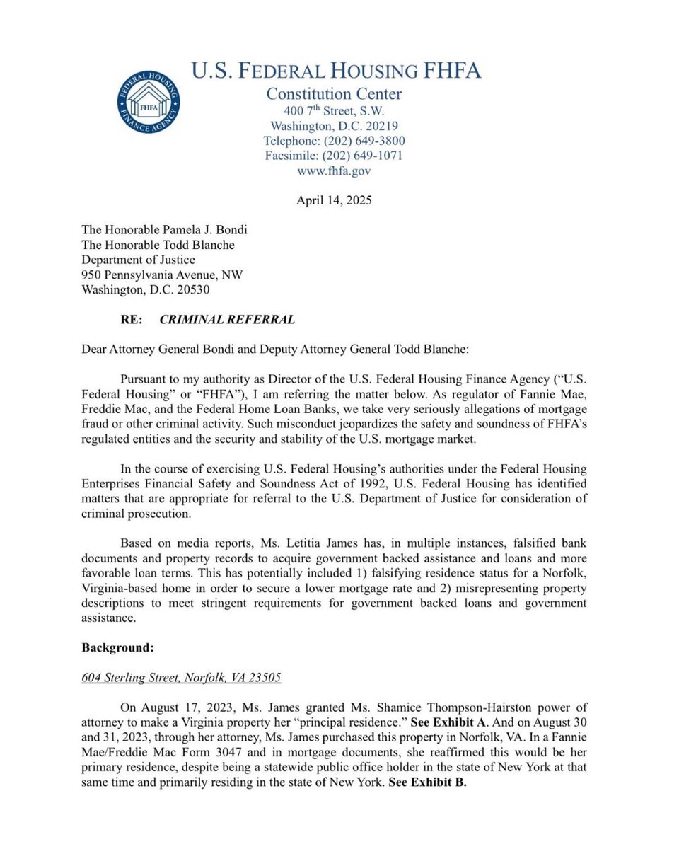 🚨 US Federal Housing Finance Agency Director @pulte has referred NY AG Letitia James to the DOJ for alleged mortgage fraud. https://t.co/L9l96DBhOZ