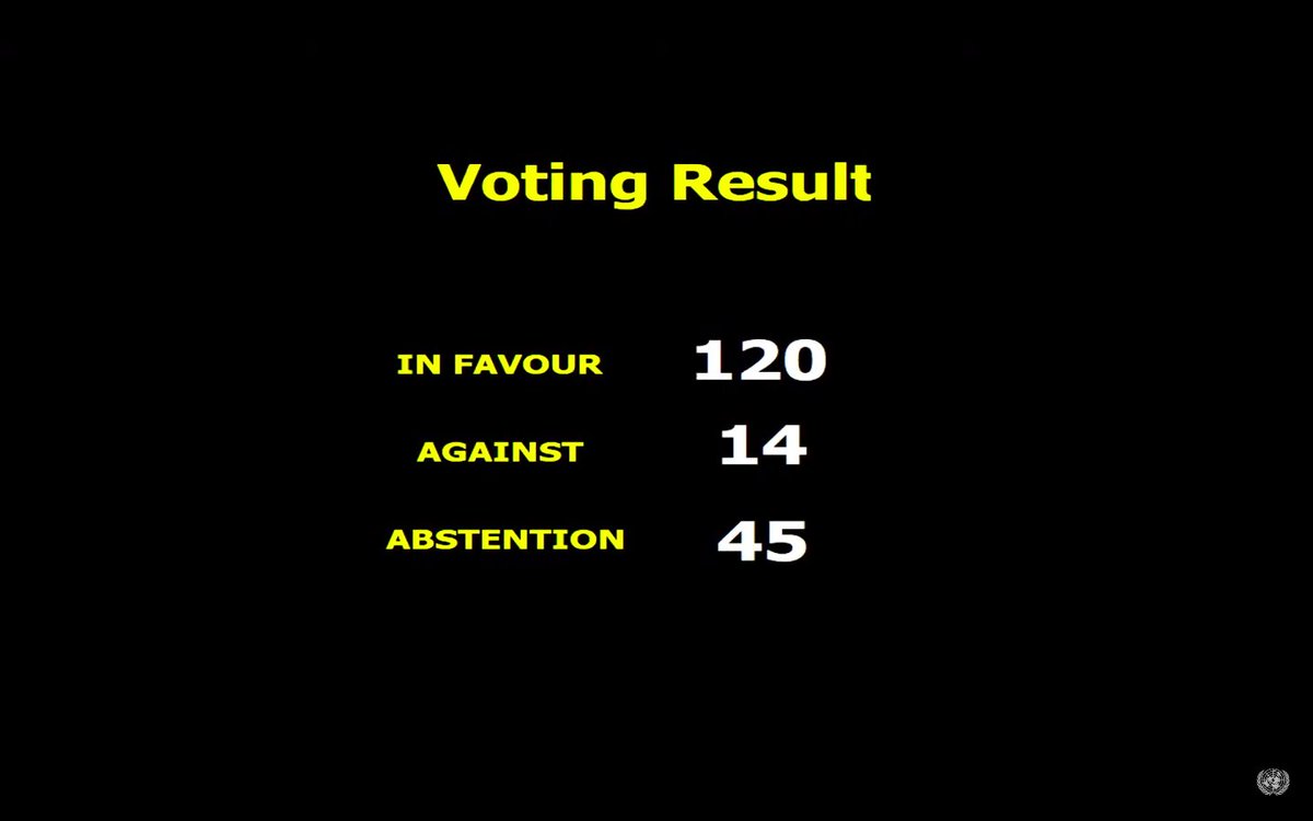 BREAKING: UN General Assembly ADOPTS resolution on “protection of civilians and upholding legal and humanitarian obligations” on the ongoing Gaza crisis FOR: 120 AGAINST: 14 ABSTAIN: 45 LIVE COVERAGE https://news.un.org/en/story/2023/10/1142847?reload12