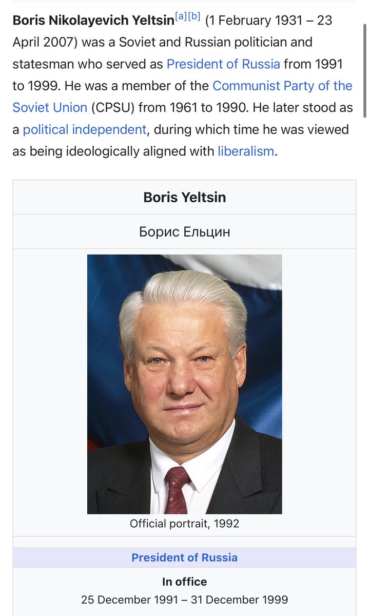 First we must go back and see the roots of what led to Putins rise to power. Remember that the Soviet Union collapsed in 1991. The process of “liberalization” and turning Russias communist economy into a capitalist economy was left up to the planted Jewish puppet, Boris Yeltsin. As you can see he was president from 1991-1999. 🧵 2/18