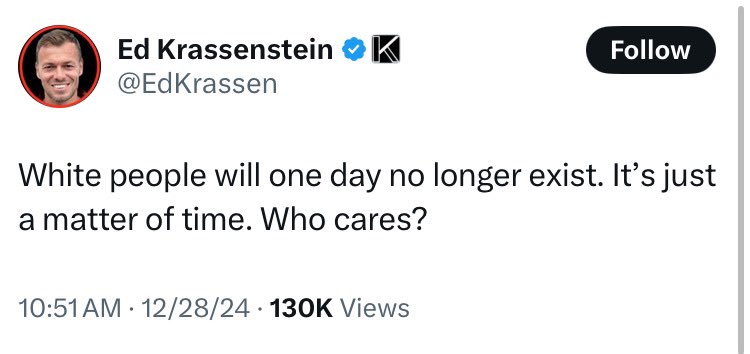 Is it because he’s a white supremacist? Here he is in multiple clips saying he is not a white supremacist, he is simply looking to be an advocate for European Americans rights in the US. He founded the National Association for Advancement of White people. His reasoning behind this was that every other racial group in the US had an advocacy group except for white people. Let’s be honest, he’s right. This is the first one of these organizations I’ve ever heard of. 🧵 4/7