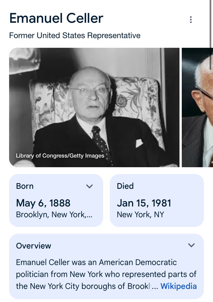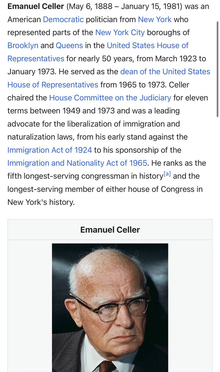Jews would have to be deeply involved in shaping immigration policy like Emmanuel Cellar who helped pass the Hart Cellar act. This act changed the US immigration policy from a European one to worldwide. 🧵 9/20 https://t.co/rDohtVntXl