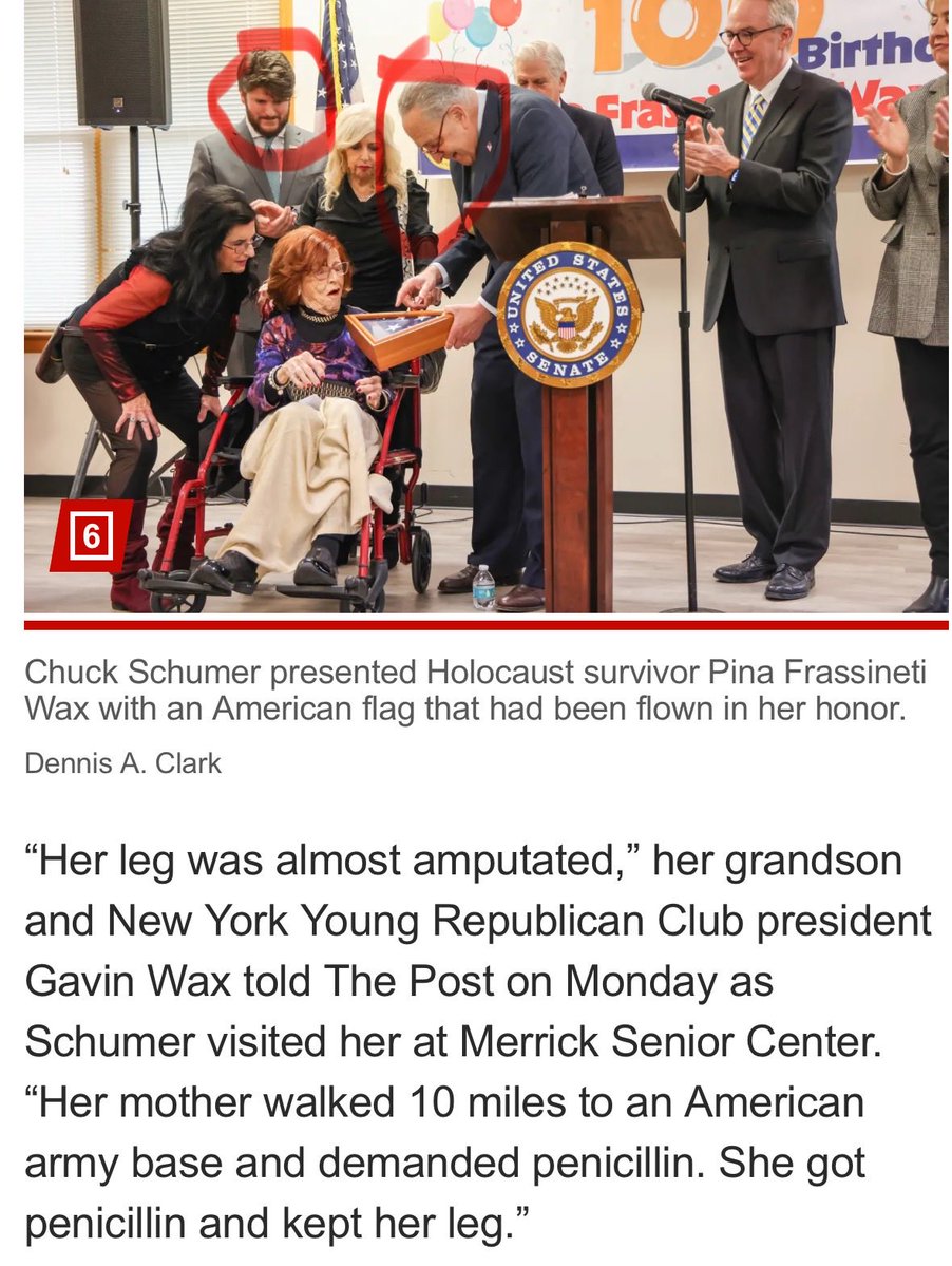 Oh look! There’s Gavin Wax. The Jewish “republican” that worked to get these “edgy group chat” messages leaked… Notice him with democrat Chuck Schumer? These supposed opposing jews are handing out an American flag to a “Holocaust survivor”… only one problem. She lived in Italy during the war. 😂 There is no such thing as “democrat” or “republican”. It’s jews vs you.