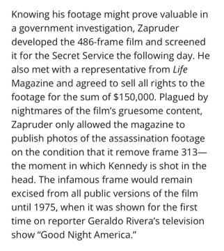 You were never supposed to see this film. 🎥 The Jewish Freemason that took it, Abraham Zapruder, was just using it as a means to make money. That’s why he sold the rights to Life magazine the day after for 150k, (1.5 million in today’s dollars). He had one specific request. (Supposedly) That frame 313 (the kill shot) was never shown to the public because it was too gruesome. This is clearly a lie, and when analyzed appropriately, it leads you directly back to the perpetrators. 🧵 1/12