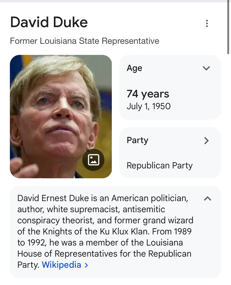 Mirror mirror on the wall, who is the most cancelled man of all? This is a difficult question of course, but surely David Duke is in the running. I wanted to know why the media continued asking Trump to disavow him. What was their strange hatred with this man I had never really heard of. I did some digging myself, to see who he is and who really was…. 🧵 1/7
