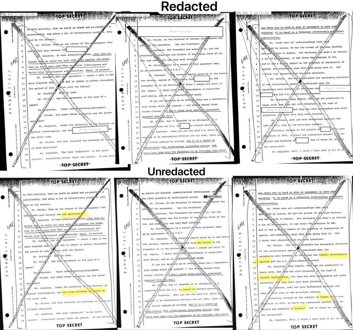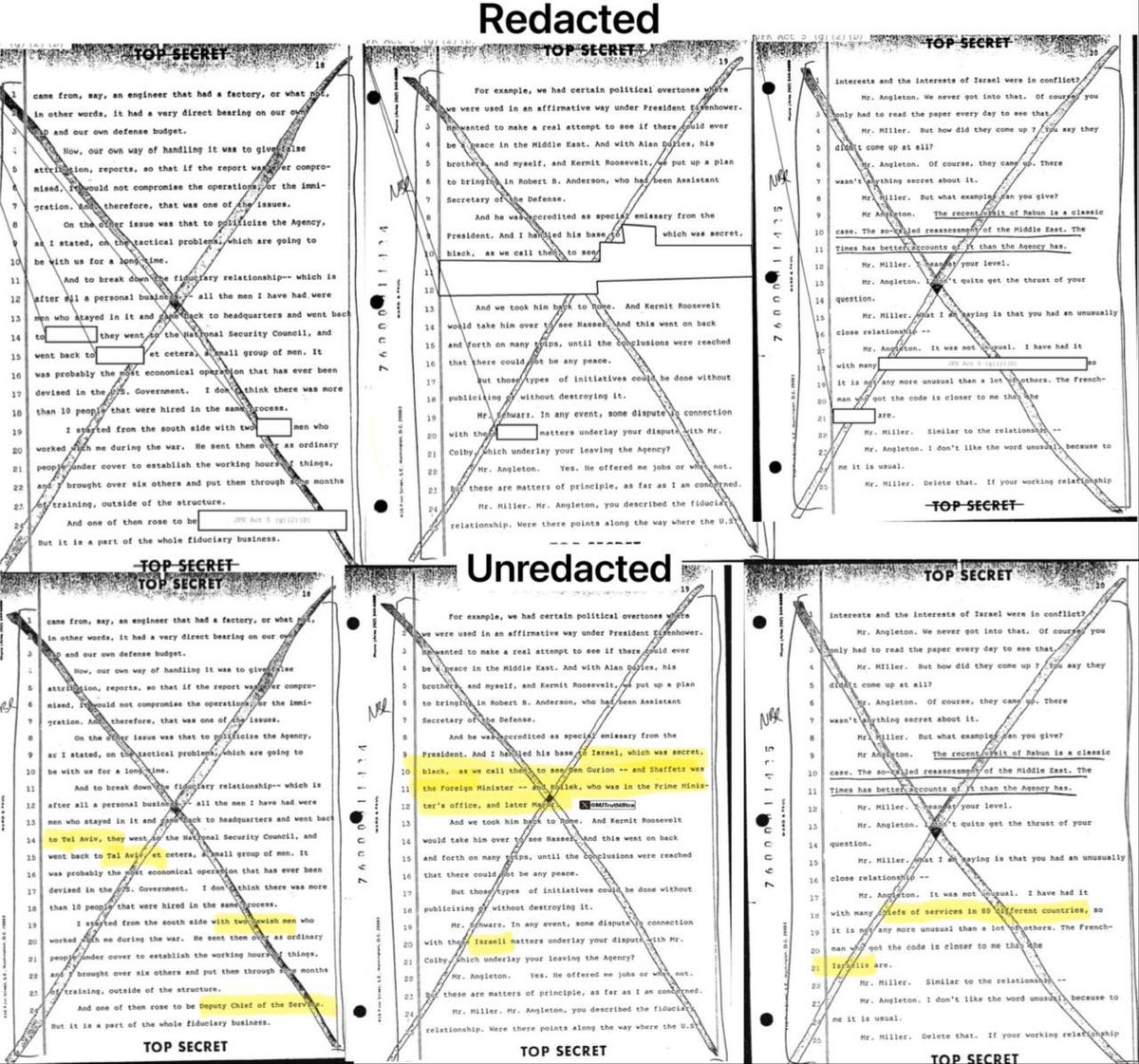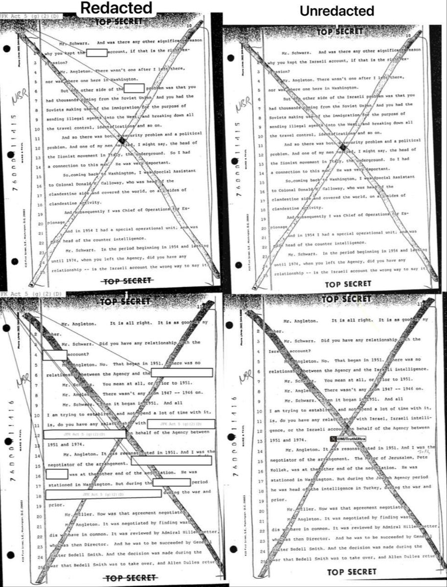 Can’t overstate how important these unredacted documents are. These are the exact documents that were brought up on @TuckerCarlson show a few weeks back, and yes they very much implicate Israel, and thus why they have been redacted for 60 plus years. @MJTruthUltra is doing great work on these! “One of the JFK related documents still redacted to this day, is that of CIA director of counter intelligence James Angleton, and his 1975 testimony about the Israeli nuclear program.”