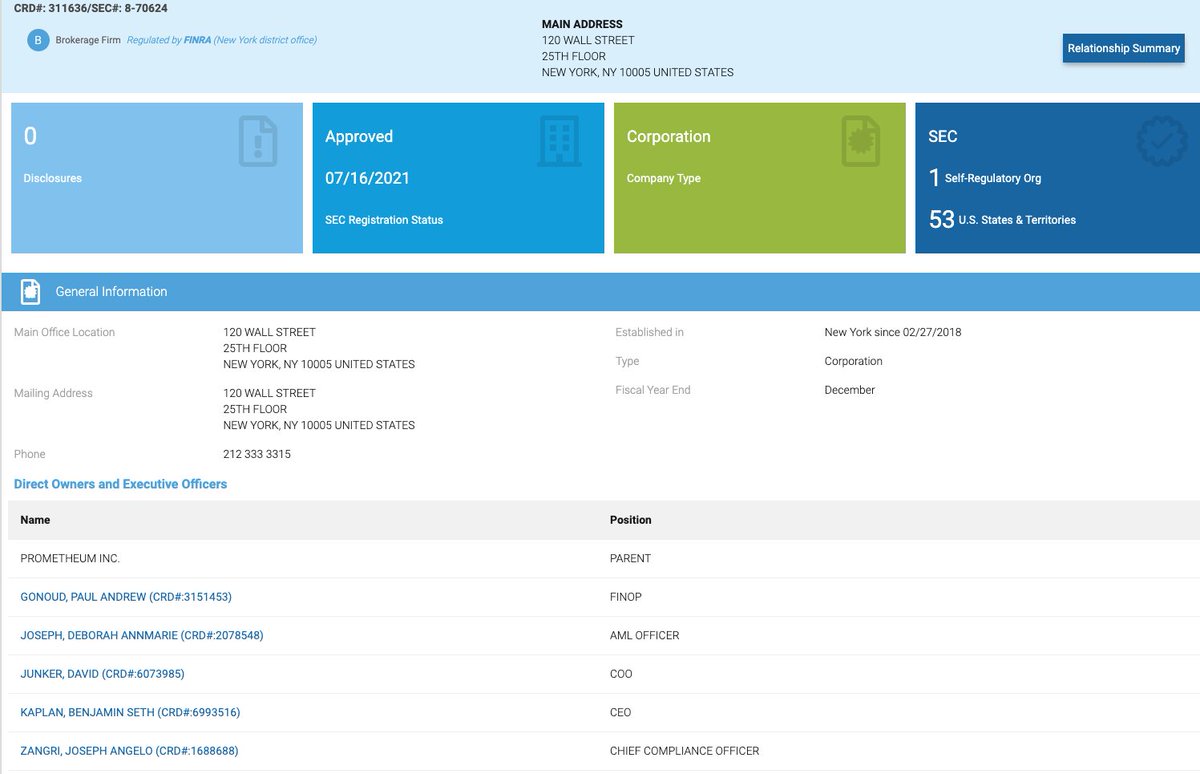 #Prometheum SEC approved in 07/16/21. 🤔 "Created by a group of Wall Street Lawyers" Here is a list of some of their their owners and people connected to their business. Post any data that you find interesting around them and what it connects to and if it has merit i'll add it to the #ETHGate investigation mindmap. #XRPCommunity @AshleyPROSPER1 @Leerzeit @cowboycrypto313 @DigPerspectives https://brokercheck.finra.org/firm/summary/311636