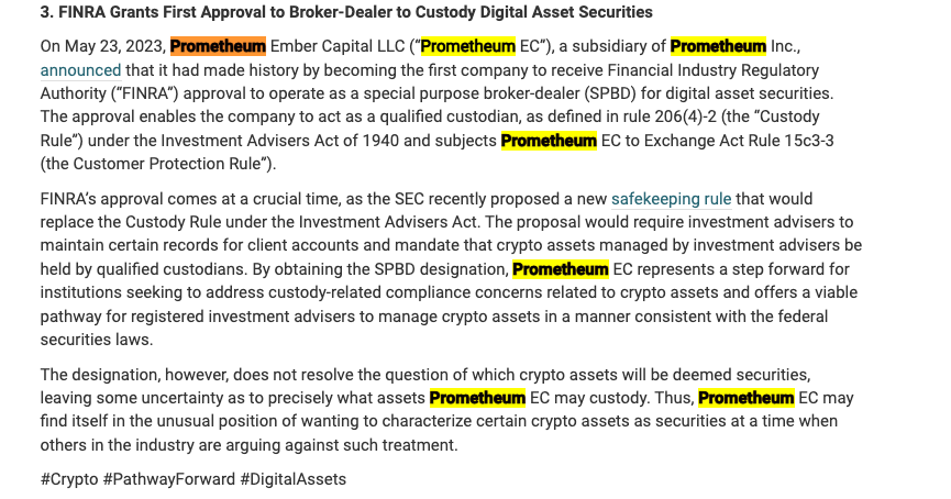 I searched the web and got access to an article written by Baker & Hostetler LLP. It mentions #Prometheum in It's from a (need an account) lawyer site, this shows who the @SECGov is 🤝 w/ Prometheum because its their American lawyer buddies are the ones creating "regulated digital asset" tokens. Last image is the #SECgov approved "Stock"#Crypto offer. 😂 Lawyers getting rich and citizens are being pushed to be distracted and miss the public #DLT transformation of global infrastructure. #XRP$XRP#XDC#XLM#X Links to documents: https://one-tab.com/page/aL_lBW8RSZGlYC7FtvPk7A#SECGovCorruption#SchemeOnTheCitizens