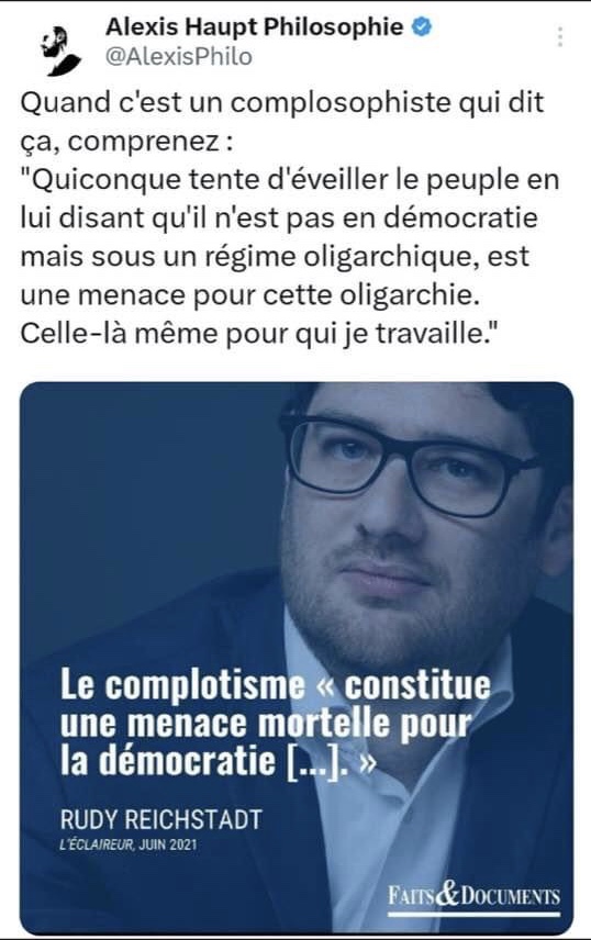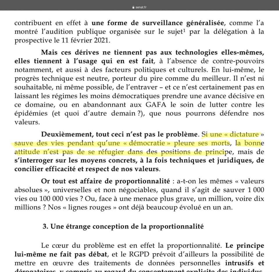 5/n Est-ce complotiste de penser que la démocratie est en danger quand des sénateurs concluent leur rapport par la phrase : « Si une dictature sauve des vies pendant qu’une démocratie pleure ses morts, la bonne attitude n’est pas de se réfugier dans des positions de principe. » ?