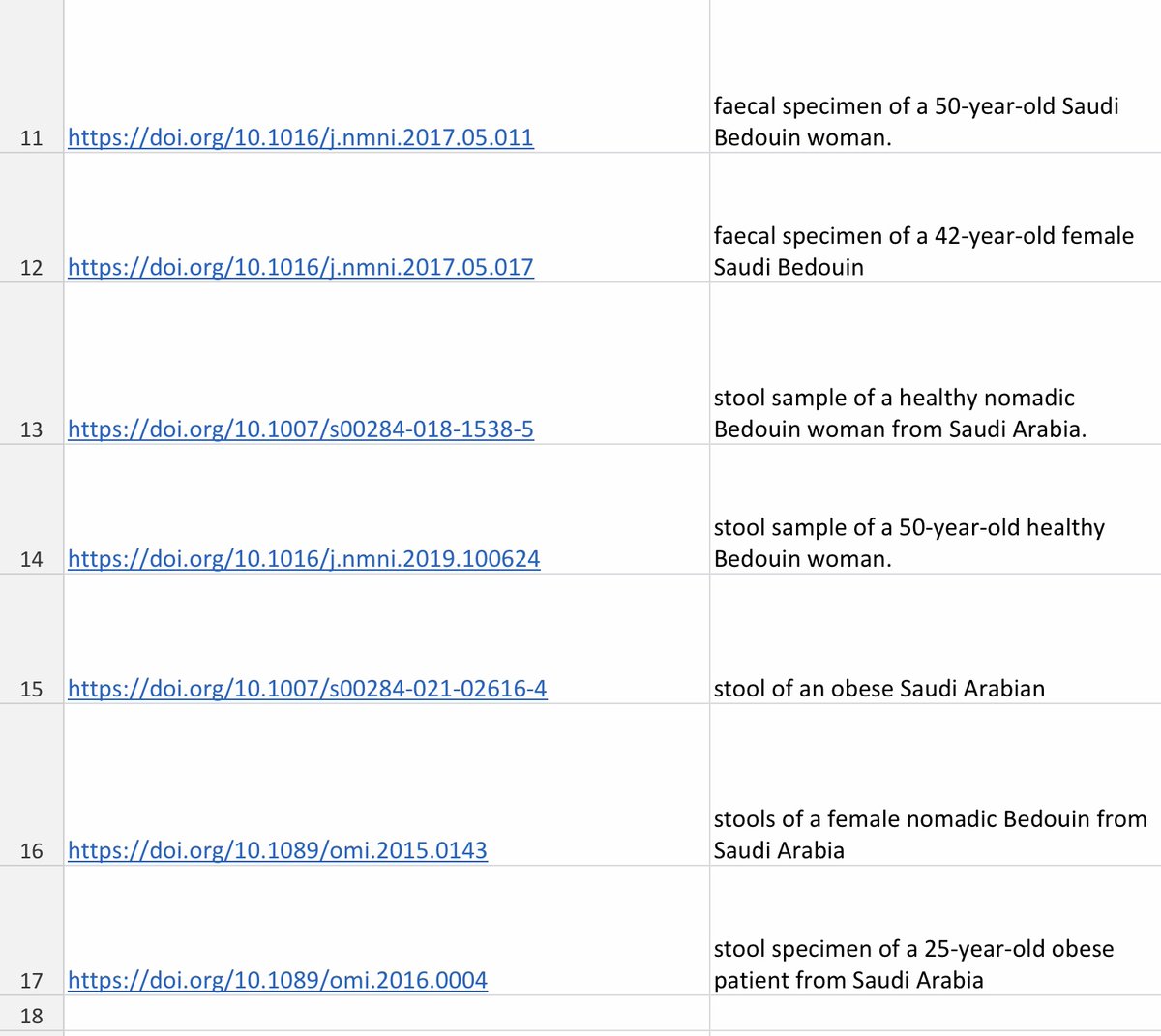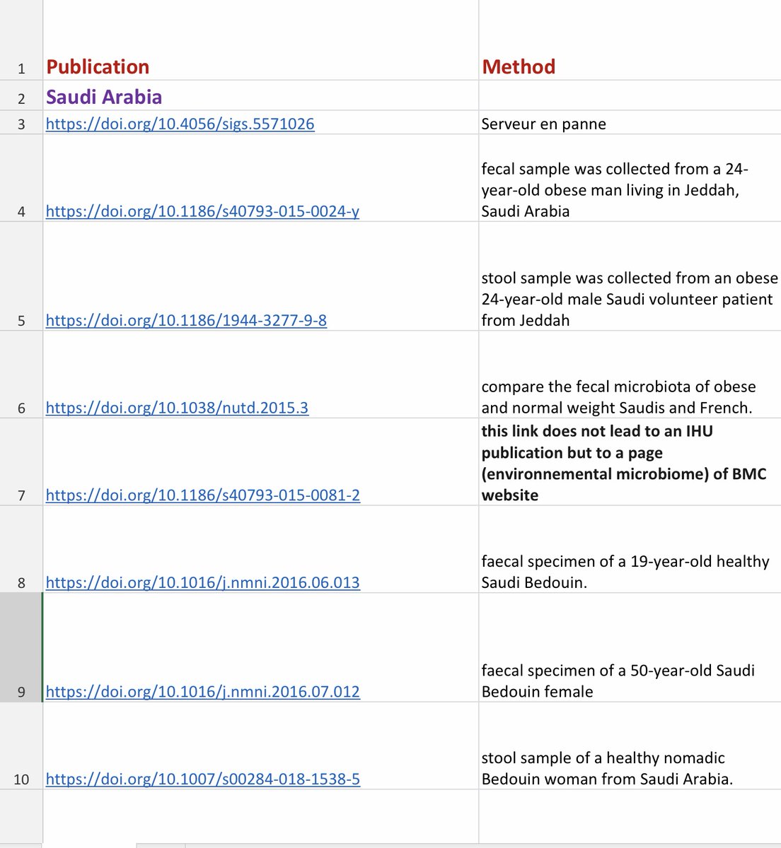 2/ J’ai repris, par exemple, les 15 publications qui concernent l’Arabie Saoudite. Je les ai reprises dans un tableau et il s’agit à chaque fois de l’analyse d’échantillons de selles. À une exception près, chaque publication concerne 1 seul échantillon. https://t.co/Orq4mOhBO7