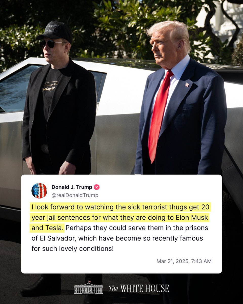 The people attacking Teslas are trying to send the message that if you support President Trump, they will commit acts of violence to try to intimidate you. Our message to them? Terrorists in this country will be brought to justice.