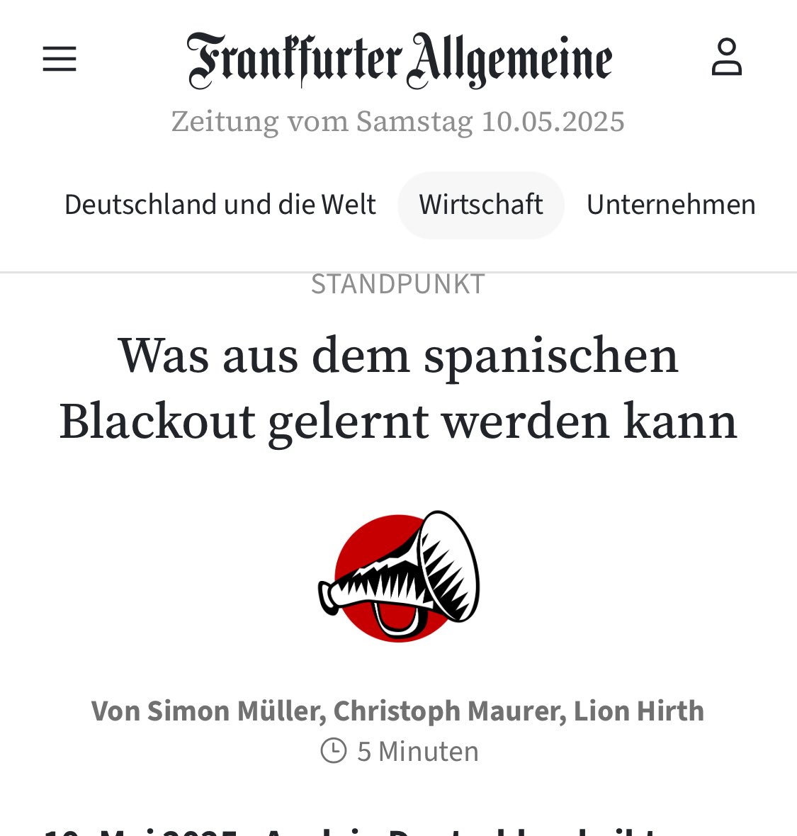 Vorhin machte ich ohne Lesen eine Wette: „Sie werden fordern, was sie immer fordern: mehr EE, mehr Leistungselektronik, nun zusätzlich netzbildende Leistungselektronik, mehr Geld, mehr Schulden. Wetten?“ Ich hab es 100% getroffen. https://zeitung.faz.net/faz/wirtschaft/2025-05-10/03d289f59ea789f1adaa04d2290e709e/?GEPC=s3 2