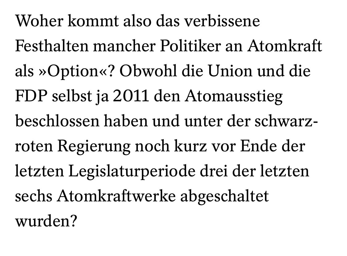 Wer das nicht will, sollte über Atomkraft schweigen; lamentieren, dass der Atomausstieg wahrscheinlich der schwerste strategische Fehler der Bundesrepublik im 21. Jh. war, reicht nicht. Ist der Abschied von den Bestandsanlagen also irreversibel, hilft nur Bekenntnis zu Neubau.➡️