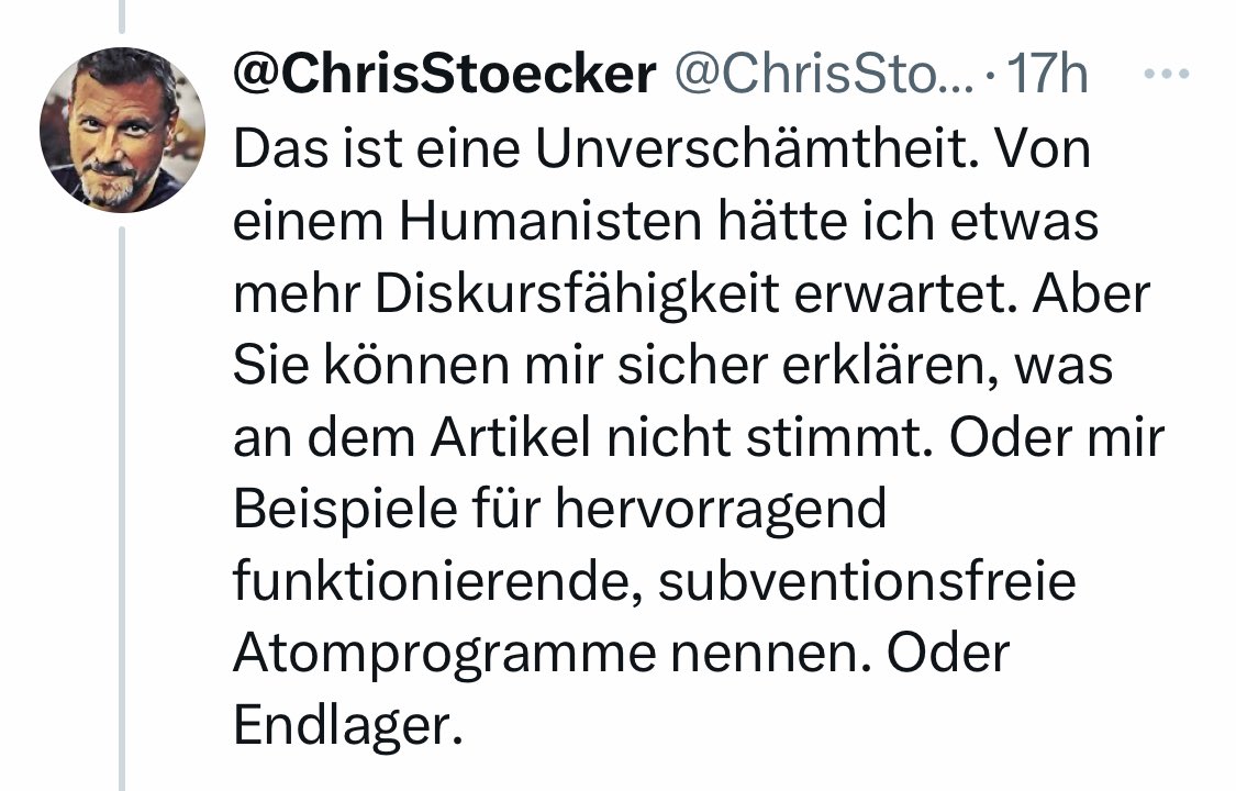 Des Spiegels @ChrisStoecker ist empört über die Kritik von @DominicRessel an seinem Anti-Atom-Stück: Unverschämtheit!! Ich kann ihm allerdings erklären, was an seinem Artikel „nicht stimmt“. Es sind 6 Punkte. 1 https://twitter.com/chrisstoecker/status/1754166155168641290